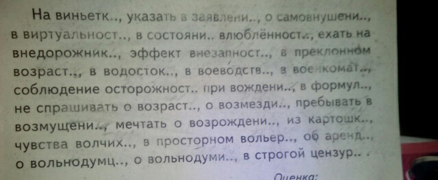 На виньетке, указать в заявлении, о самовнушении,. в виртуальности, ехать на внедорожнике, эффект внезапности, в преклонном возрасте, в водостоке, в воеводстве, в военкомате, соблюдение осторожности, при вождении, в формуле, не спрашивать о возрасте, о возмездии, пребывать в возмущении, мечтать о возрождении, из картошки, чувства волчихи, в просторном вольере, об аренде, о вольнодумце, в строгой цензуре.