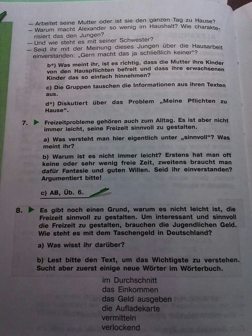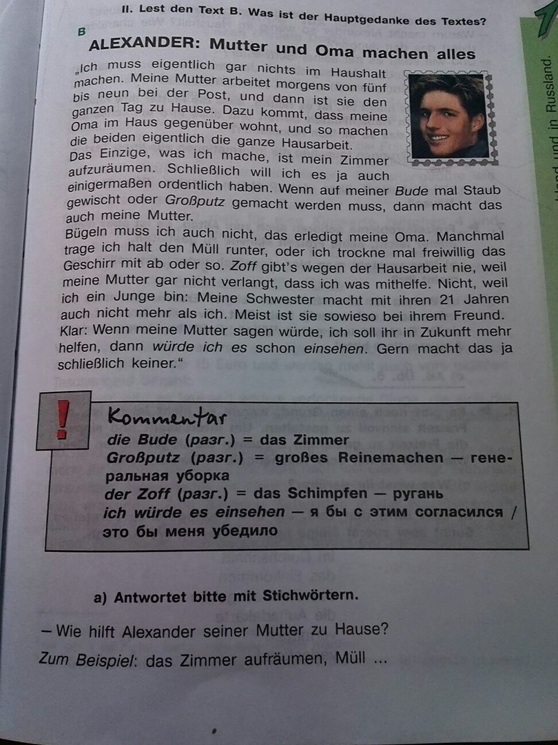 "Собственно говоря,по хозяйству я ничего делать не должен. Моя мать работает на почте по утрам,с 5 до 9,а затем весь день она дома. Так вышло,что моя бабушка живёт в доме напротив,и поэтому всю работу по дому они делают вдвоём. Единственное,что я должен делать,это наводить порядок в своей комнате. В конце концов я сам хочу в какой-то степени быть аккуратным. Когда в моей комнате требуется протереть пыль или провести генеральную уборку,тогда этим занимается моя мать.