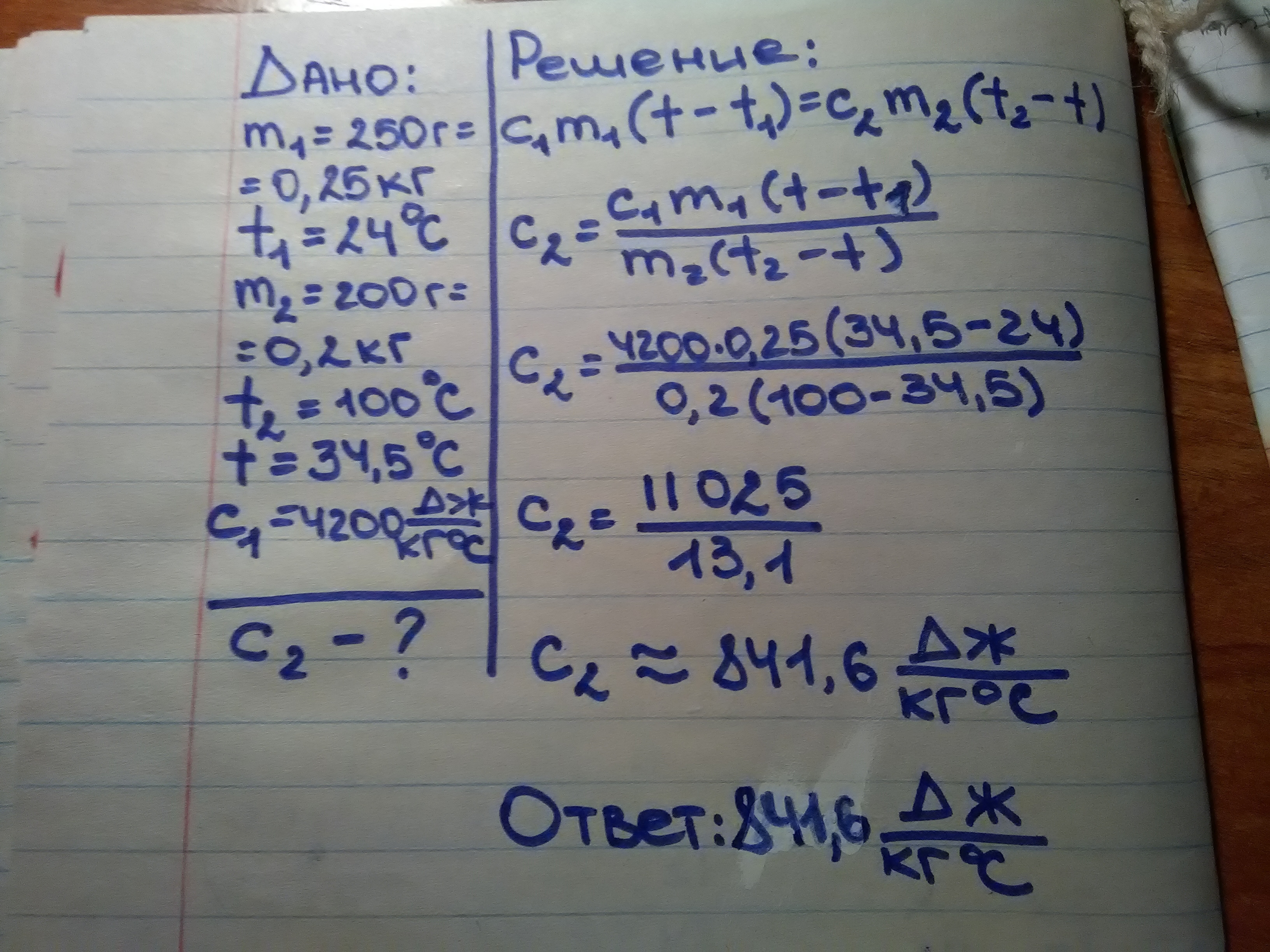 В калориметр, содержащий воду массой 250 г при температуре 24°С, опустили твёрдое тело массой 200 г при температуре 100°С. После этого вода и тело приобрели температуру 34,5°С. Какова удельная теплоёмкость твёрдого тела ?