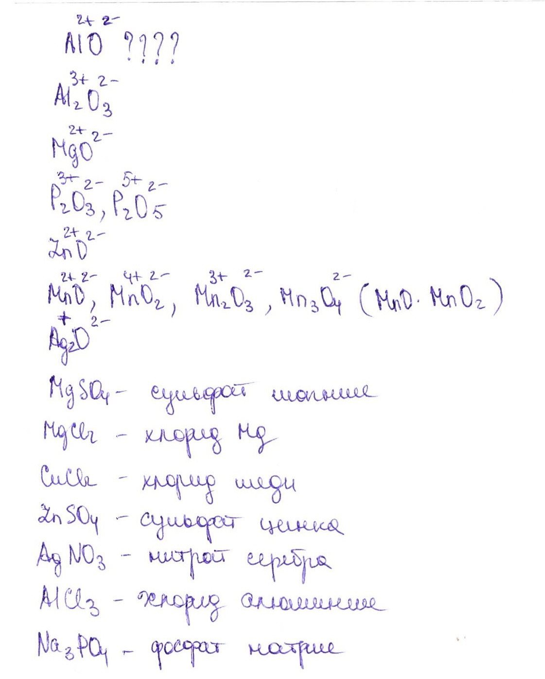 написать формулы оксидов: Al(2), Al(3), Mg, P, Zn, Mn, Ag солей: сульфат магния, хлорид магния, хлорид меди, сульфат цинка, нитрат серебра, хлорид алюминия, фосфат натрия.