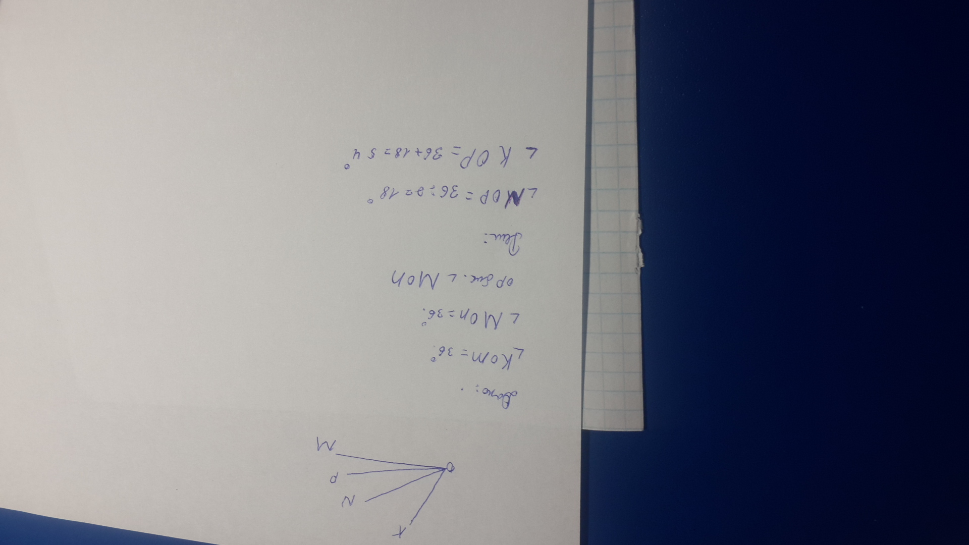 Луч ON делит угол KOM на два угла /KOM= 36*. /MON=36* Луч OP-биссектриса угла угла MON. Найдите угол KOP.