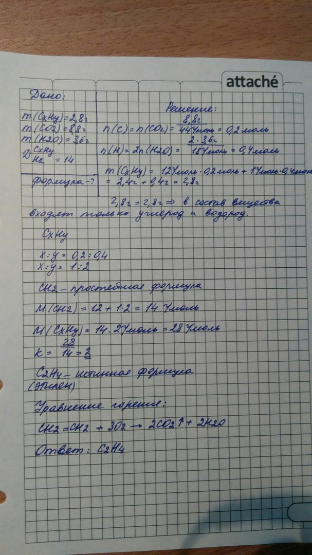 При сжигании 2,8г вещества было получено 8,8г оксида углерода(IV), 3,6г воды. Плотность газа по водороду равна 14.Определите формулу газообразного вещества. Запишите уравнение горения этого вещества.