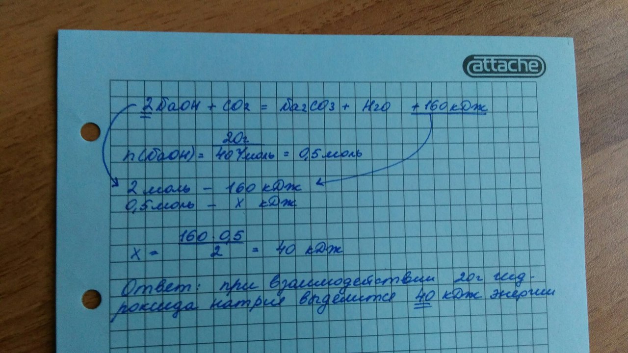 термохимическое уравнение реакции 2NaOH+CO2= Na2Co3+H2O+160 кДж, какая энергия выделится при взаимодействии 20 г гидроксида натрия