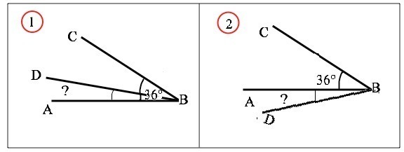 2). Луч ВD проходит вне угла АВС. Тогда угол СВD=∠АВС+∠АВD=3∠ ABD. 3∠ABD=∠ABD+36°, откуда 2∠ABD=36°, ⇒ ∠АВD=36°:2=18°