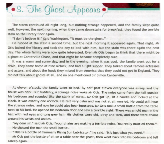 В одиннадцать часов семья легла спать. К половине двенадцатого все спали и в доме было темно. Но вдруг, странный шум разбудил мистера Отиса. Он вышел на шум за пределами своей спальни, звучащий как лязг металла. Мистер Отис встал, зажег свечу и посмотрел на часы. Был ровно один час. Он чувствовал себя совершенно спокойно и нисколько не беспокоился. Он все еще слышал странный шума, и теперь он слышал шаги. Мистер Отис взял маленькую бутылку со стола рядом с его кроватью. Он открыл дверь своей спальни и увидел страшное зрелище. Там был пожилой человек в зале с красными глазами и длинными седыми волосами. Его одежда была старая, грязная и рваная, и там были цепи вокруг его запястий и лодыжек.