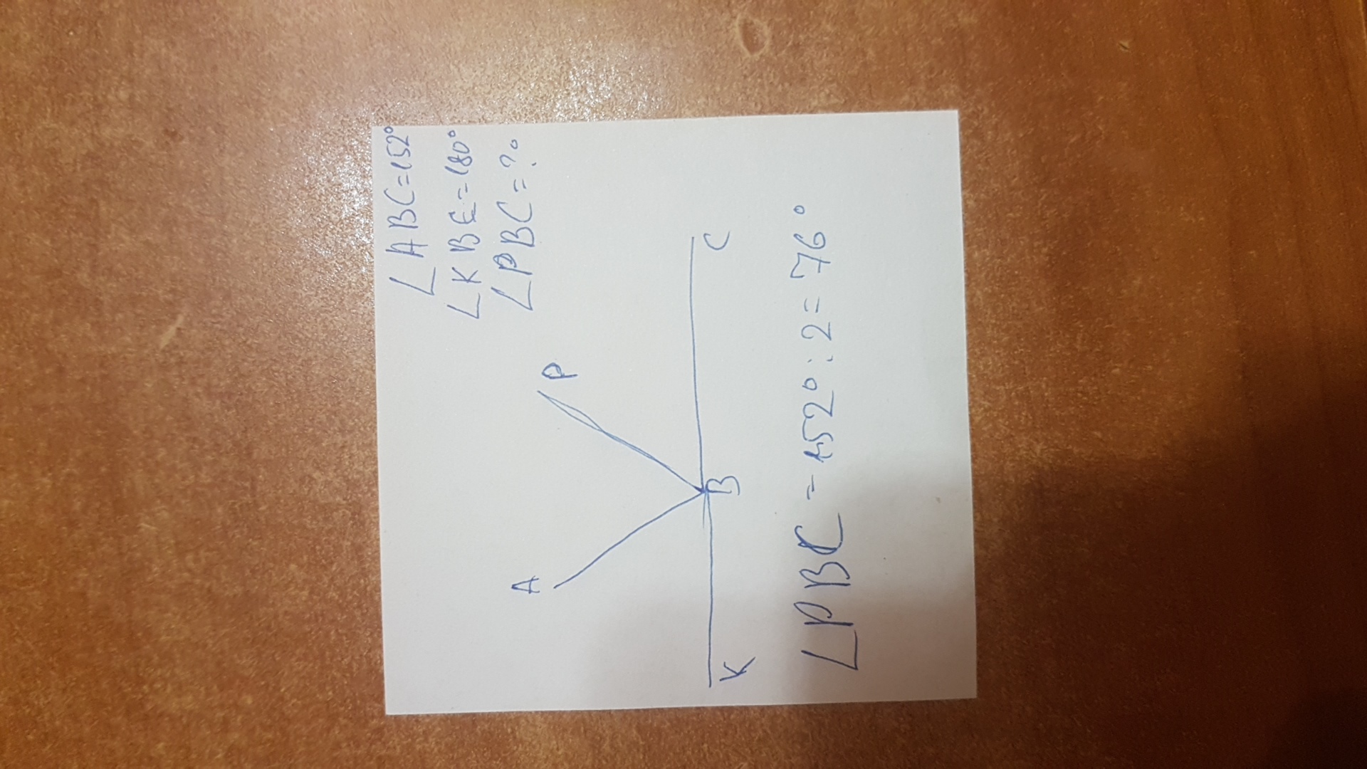 найдите угол PBK если угол ABC=152градуса BK перпендикулярен BC и луч BP является биссектрисой углаABC