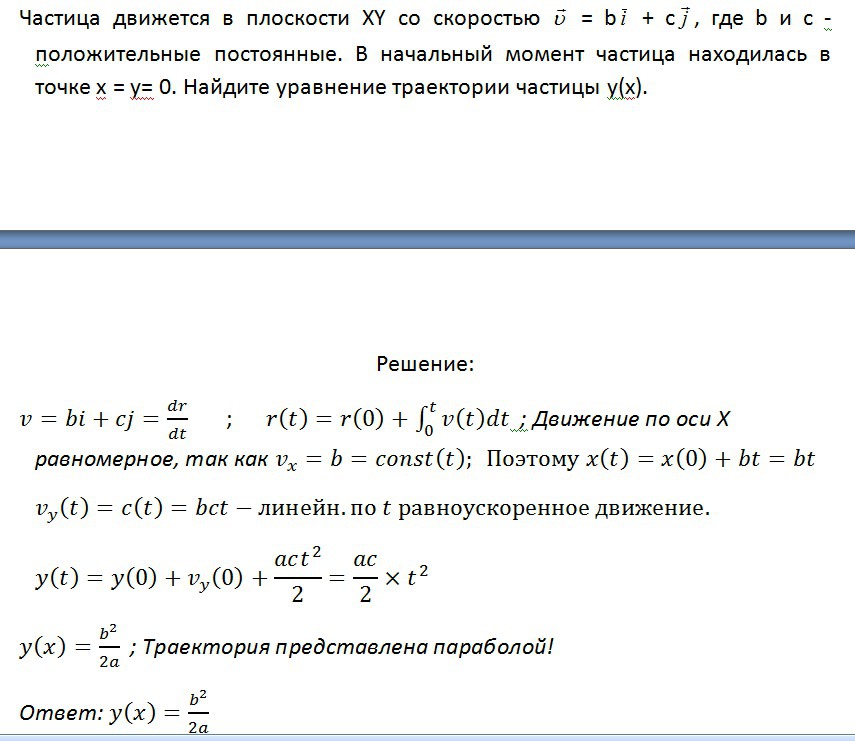 Частица движется в плоскости XY со скоростью = b + c , где b и с -положительные постоянные. В начальный момент частица находилась в точке х = у= 0. Найдите уравнение траектории частицы у(х).