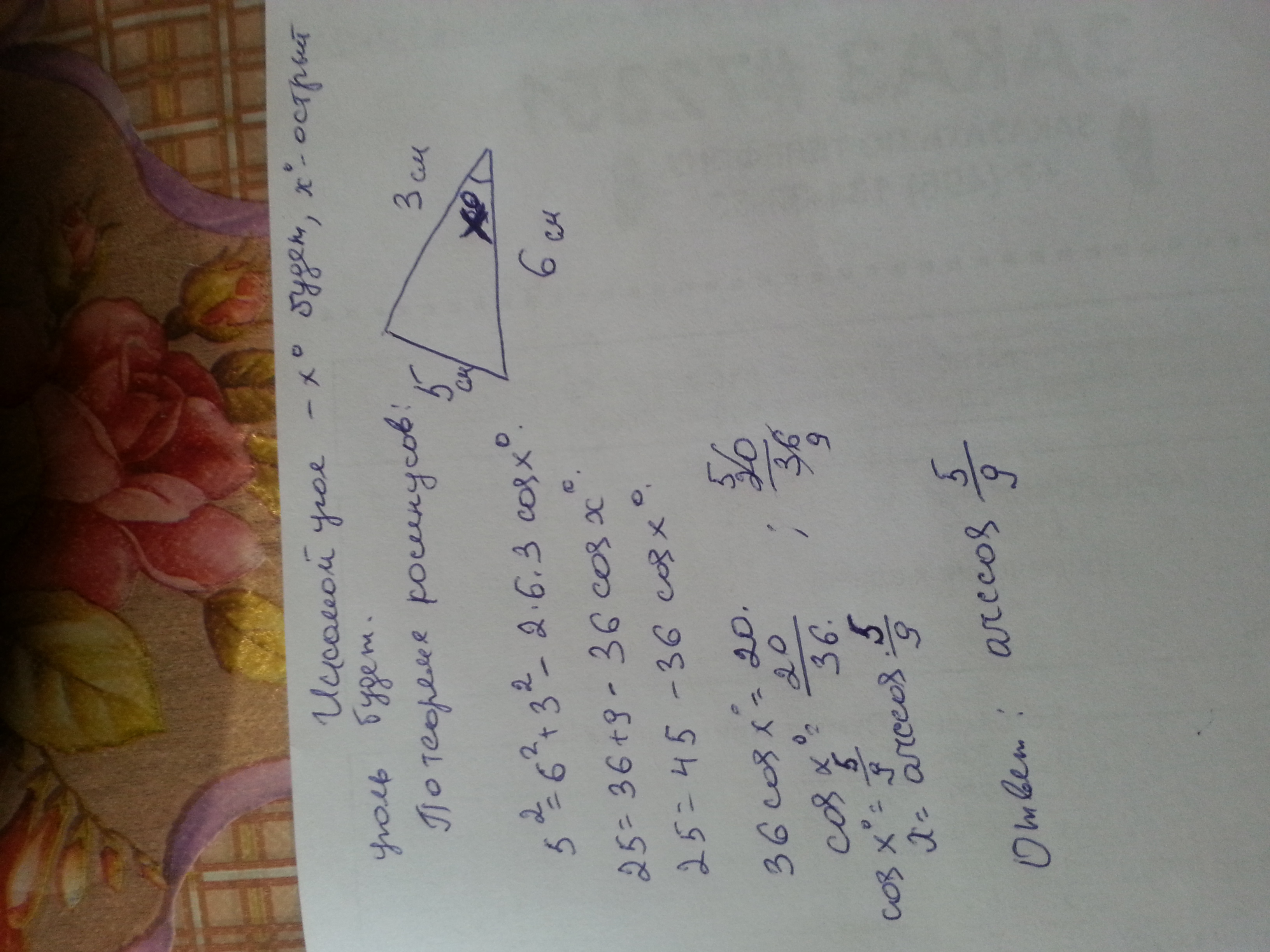 Стороны треугольника ровняются 3 см,5 см,6 см.Найти угол треугольника противоположный стороне,которая равна 5 см