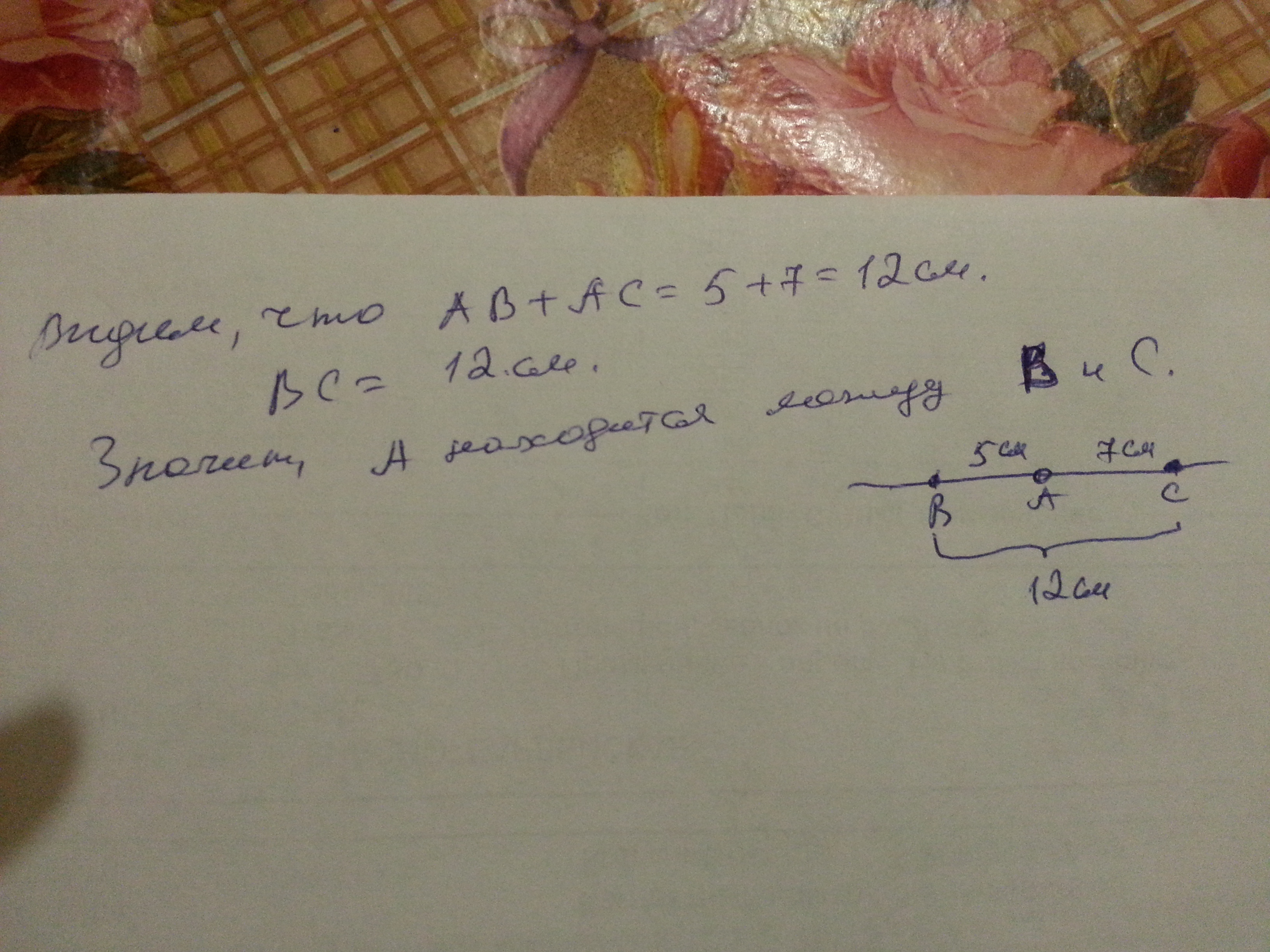 три точки A B C лежать на одной прямой какая из этих точек лежит между двумя другими. AB=5см Ac=7см BC=12см