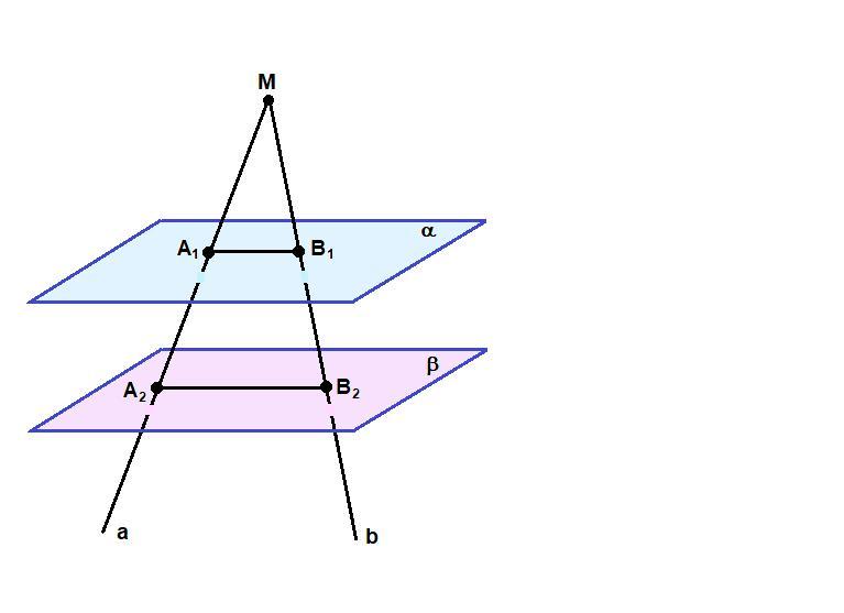 Через точку M, не лежащую между параллельными плоскостями α и β, проведены прямые a и b. Прямая a пересекает плоскости α и β в точках А₁ и А₂ соответственно, прямая b – в точках В₁ и В₂.