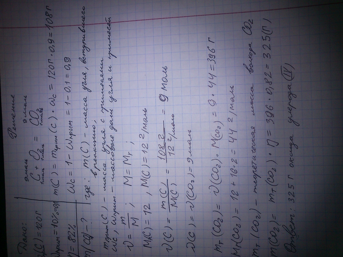 Решите, пожалуйста задачу по химии (дано, найти, решение) : сколько граммов оксида углерода образуется при сжигании 120 г угля, содержащего 10% примесей? если выход реакции составляет 82% от теоретичяески возможного.