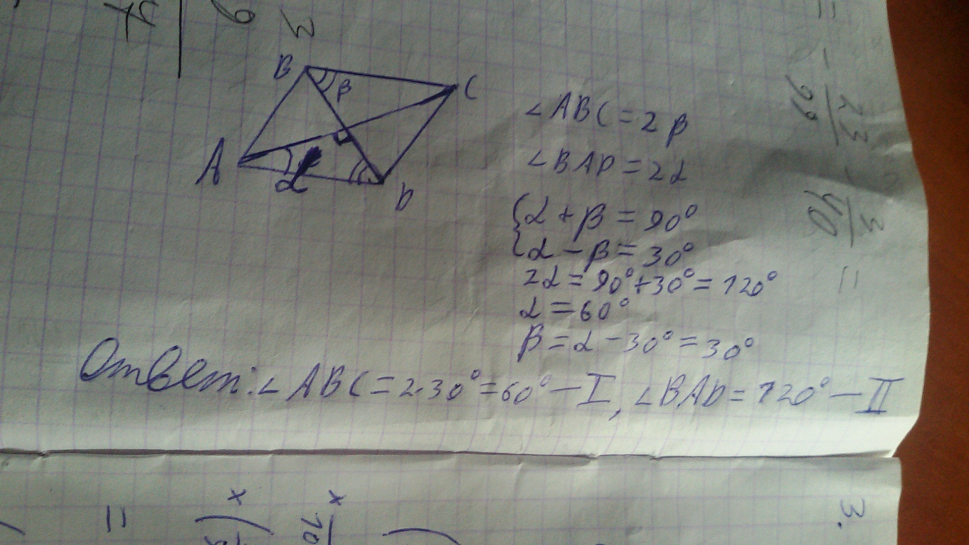 диагональ ромба образует с его стороной углы, один из которых на 30 градусов меньше другого. Найдите углы ромба.