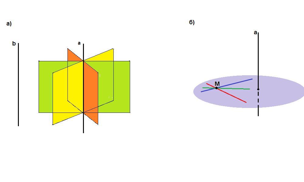 2. Через точку М, не лежащую на прямой а, можно провести бесконечно много прямых, перпендикулярных прямой а. Но все эти прямые будут лежать в одной плоскости.