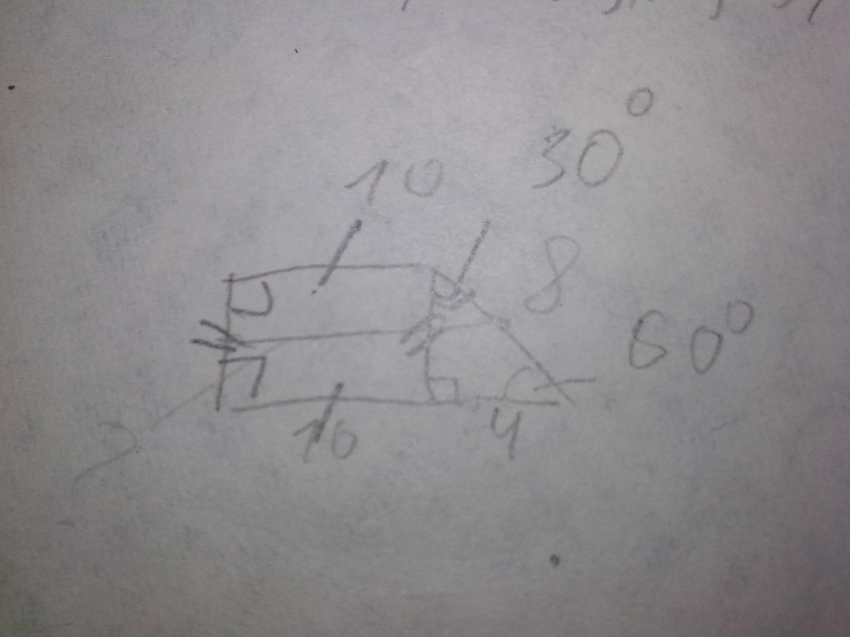 В прямоугольной трапеции меньшее основание равно 10, большая боковая сторона равна 8. Острый угол равен 60 градусов. Найдите мне пожалйста среднюю линию. И если это возможно, с объяснением) Буду очень благодарен)))
