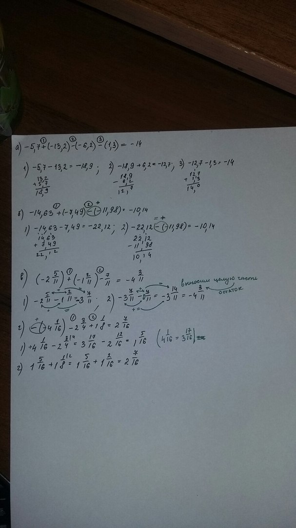 а) -5,7 + (-13,2) - (-6,2) - (+1,3) б) -14,63 + (-7,49) (-11,98) в) (-2 5/11) + (-1 2/11) - (7/11) г) -(-4 1/16) - 2 3/4 + 1 1/8