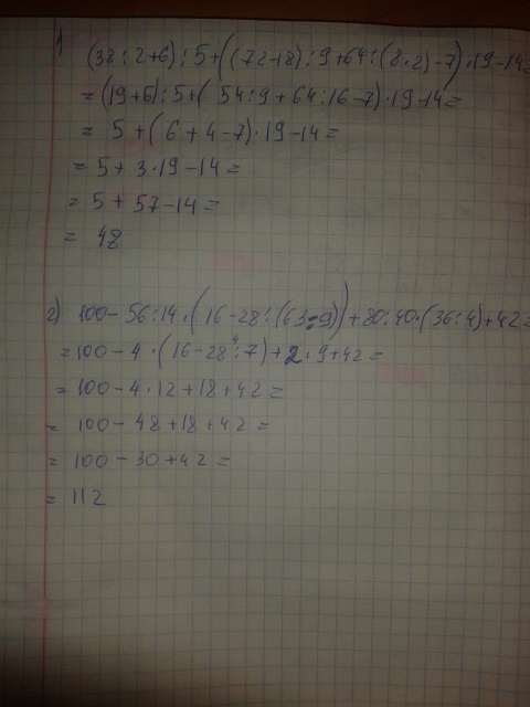 Выполни действия: 1) (38:2+6):5+[(72-18):9+64:(8*2)-7]*19-14. 2) 100-56:14*[16-28:(63:9)]+80:40*(36:4)+42.
