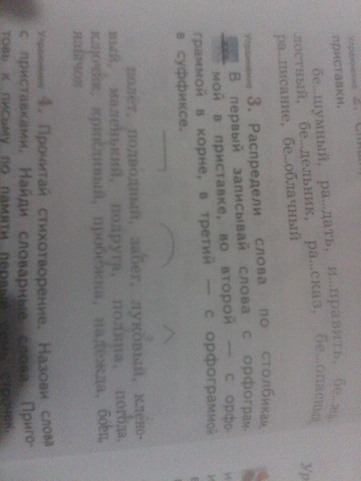 распредли слова по столбикам в первый запысивай слова с орфограммой в приставке, во второй с орфограммой в корне в тетый с орфограммой в суффиксе