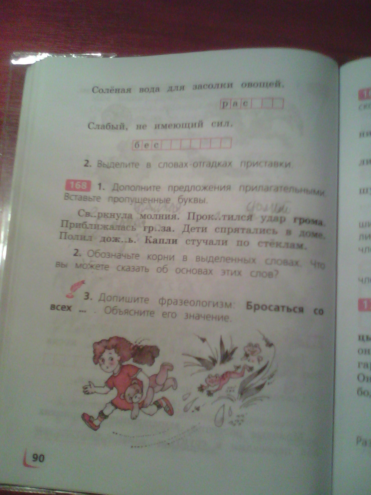 Сверкнула яркая молния. Прокатился оглушающий удар грома. Приближалась устрашающая гроза. Дети спрятались в большом доме. Полил сильный дождь. Тяжёлые капли стучали по стёклам.