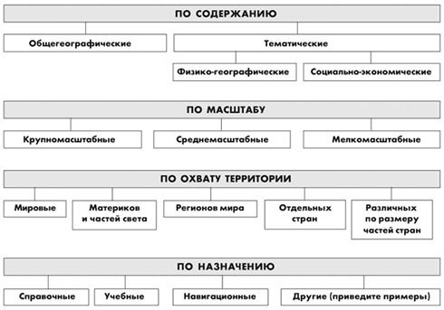 Карты бывают крупномасштабные (1 : 10 000 — 1 : 100 000), среднемасштабные (1 : 200 000 — 1 : 1 000 000) и мелкомасштабные карт (мельче 1 : 1 000 000).