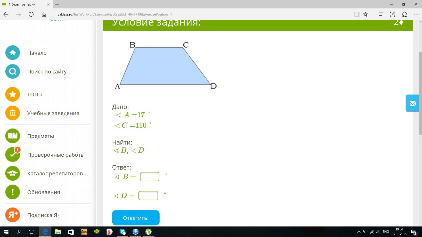 Угол А и угол Б это односторонние углы при двух параллельных прямых БЦ и АД и секущей БА. Сумма односторонних углов всегда равна 180°. Угол Б равен 180° минус угол А. Тоже самое с углами Ц и Д