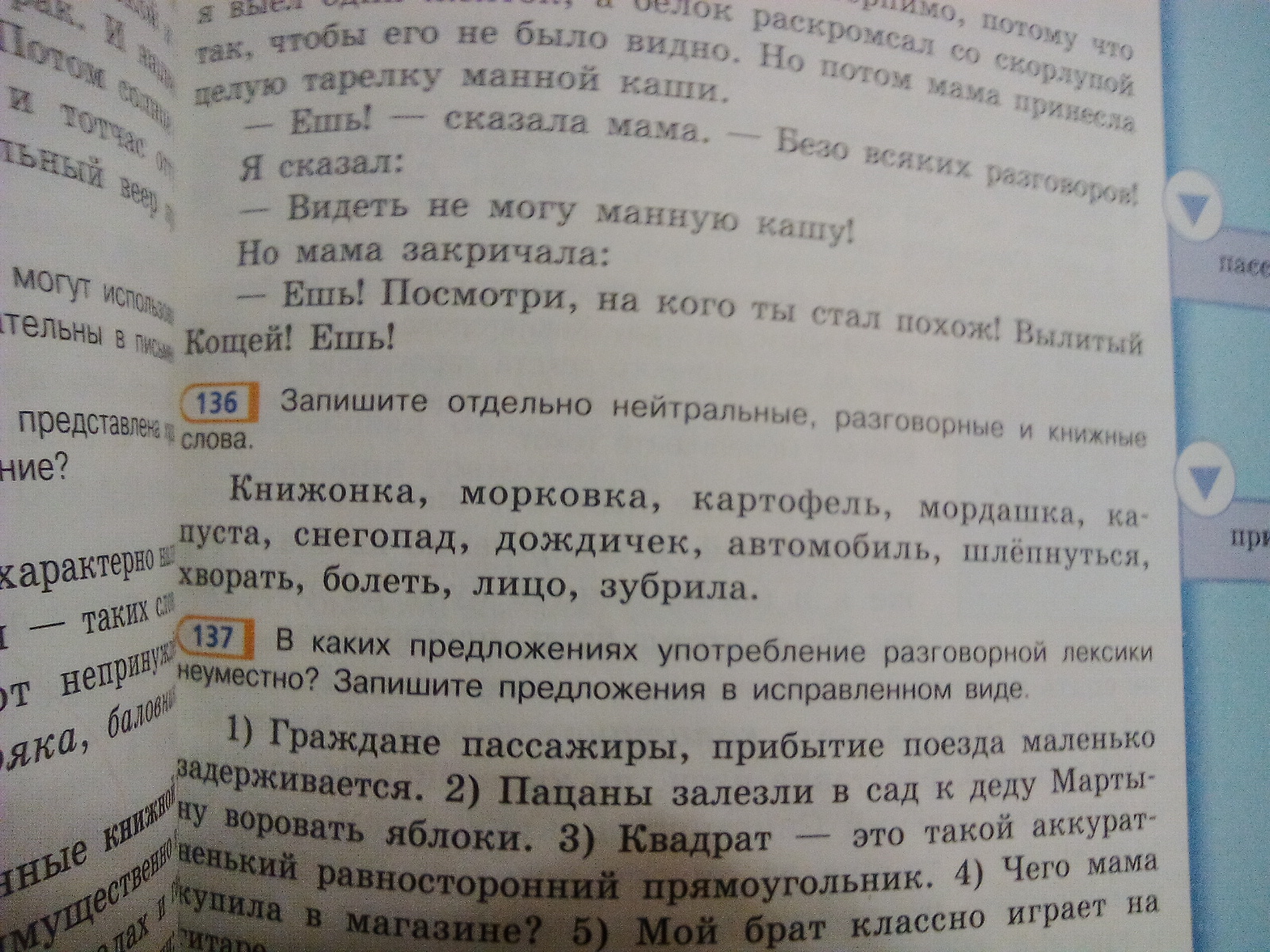 Разг.-книжонка, мордашка, дождичек, шлёпнуться, хворать, зубрила. Книжн.-картофель, снегопад, автомобиль. Нейтрал.-капуста, болеть, лицо.