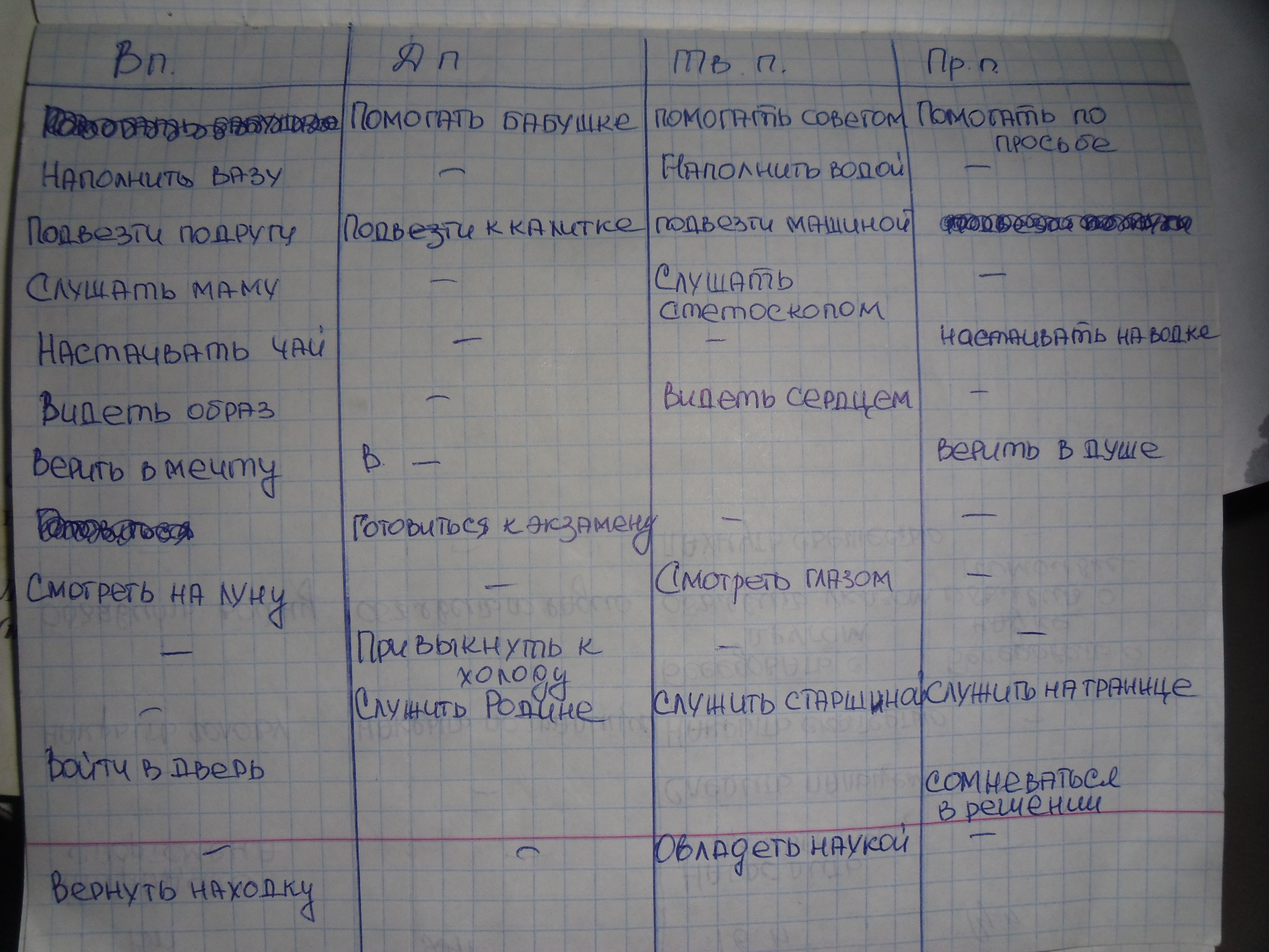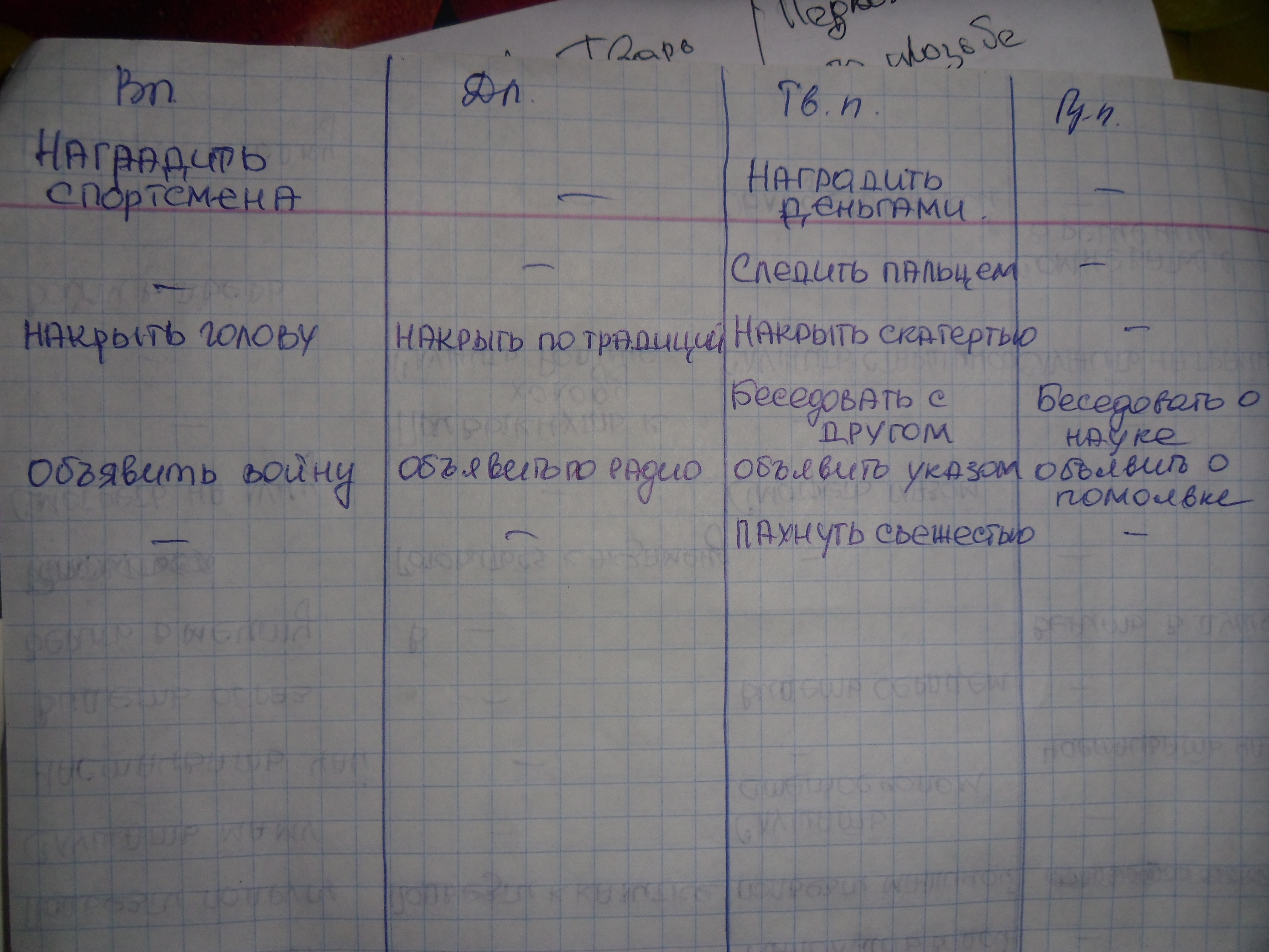 1) наполнить стакан, подвезти попутчика, слушать песню, видеть горе, верить в удачу, смотреть фильм, войти в дом, вернуть награбленное, накрыть на стол, объявить войну.