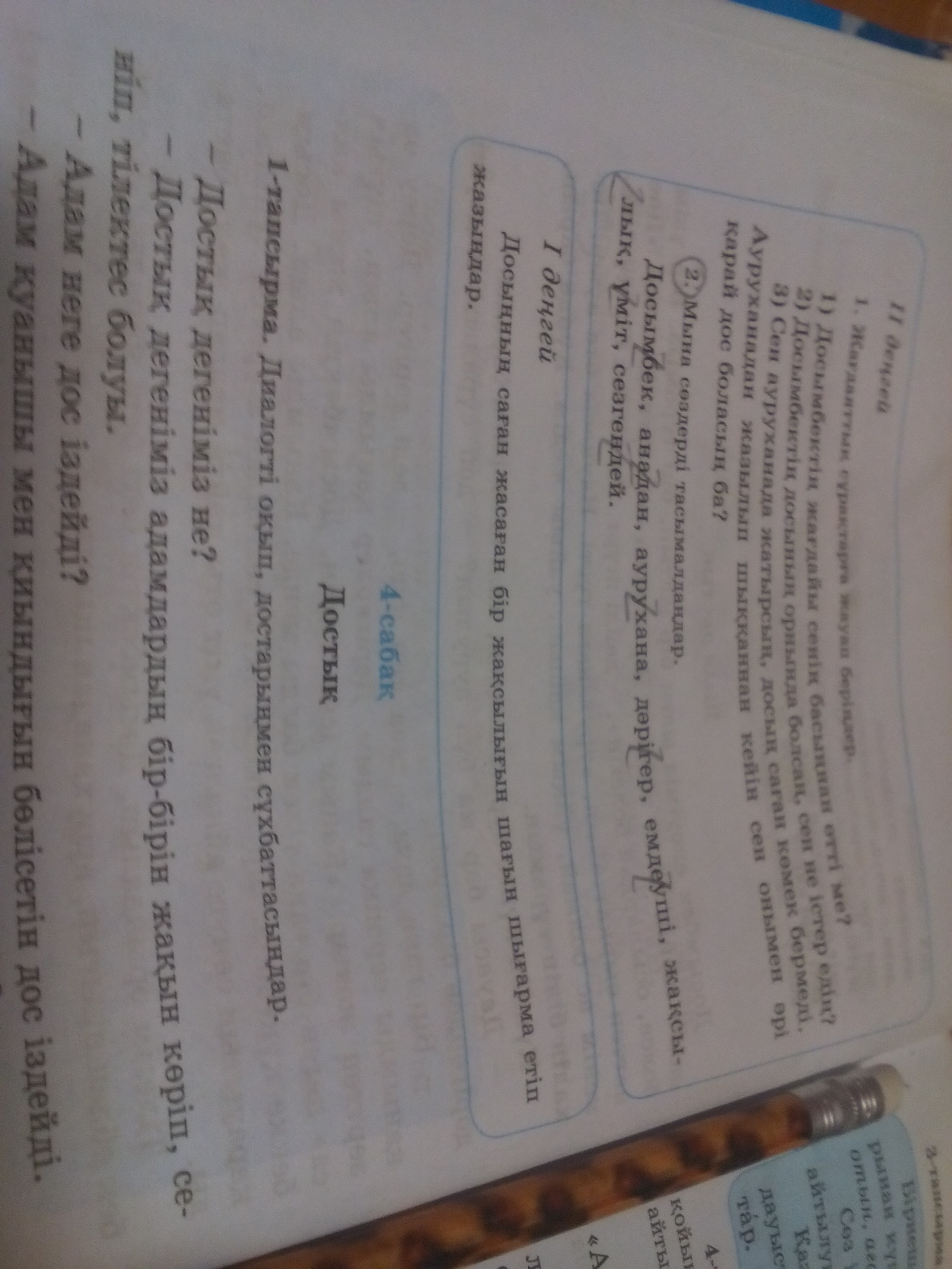 Досымбек тасымалданбайды. Ана-дан.Ау-рухана, ауру-хана,ауруха-на.Дə-рігер,дəрі-гер.Ем-деуші, емдеу-ші.Жақ-сылық,жақсы-лық.Үміт тасымалданбайды.Сез-гендей, сезген-дей