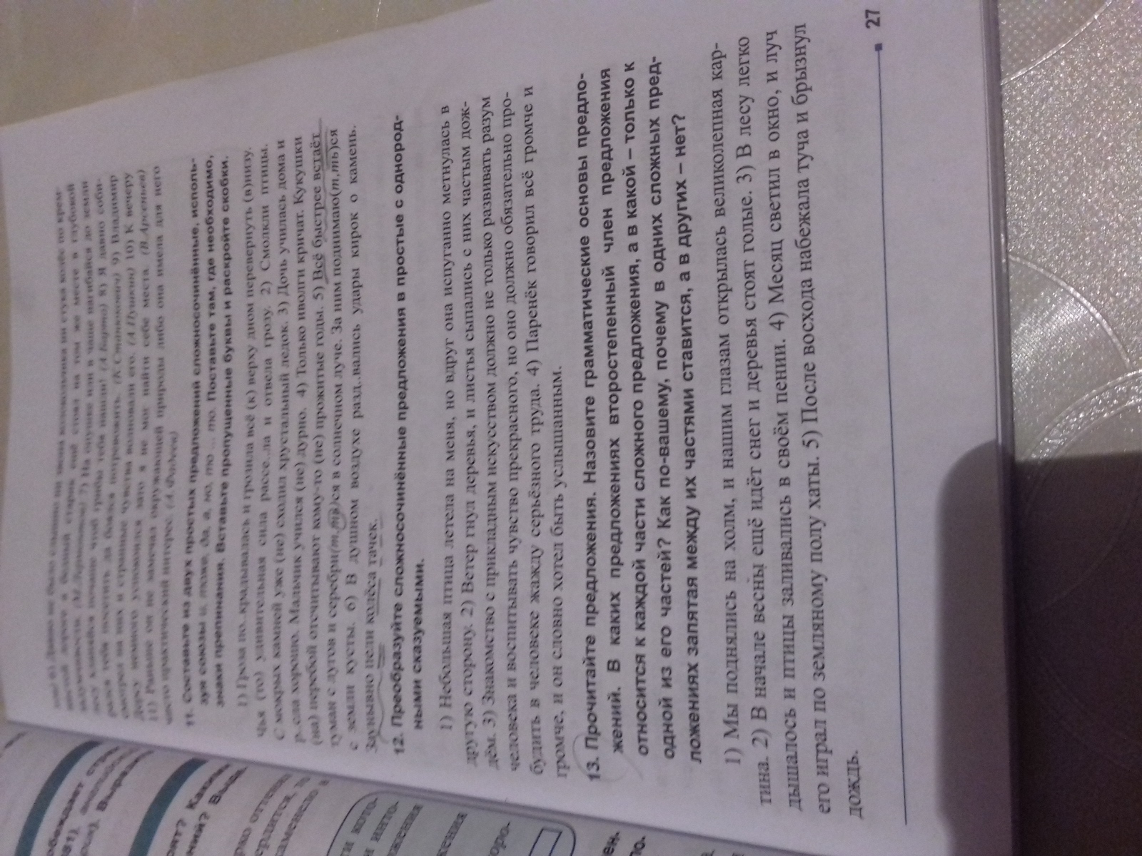 12. 1) Небольшая птица летела на меня, но вдруг испуганно метнулась в другую сторону. 2) Ветер гнул деревья и осыпал с них листья частым дождем. 3) Знакомство с прикладным искусством должно не только развивать разум и воспитывать чувство прекрасного, но обязательно пробудить в человеке жажду серьёзного труда. 4) Паренек говорил всё громче и громче, хотел быть услышанным.