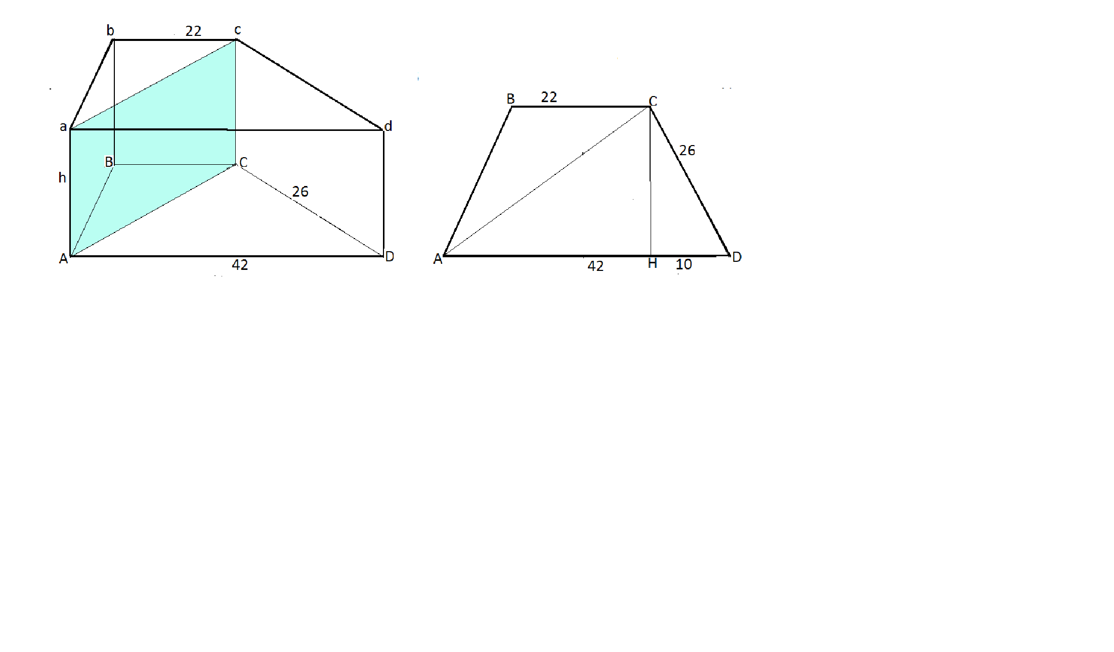 основание прямой призмы является равнобедренная трапеция, боковая сторона которой равно 26 см, а основание равны 22 см и 42 см . Площадь её диагонального сечения составляет 400 см. квадрт. Вычислить площадь полной поверхности призмы.