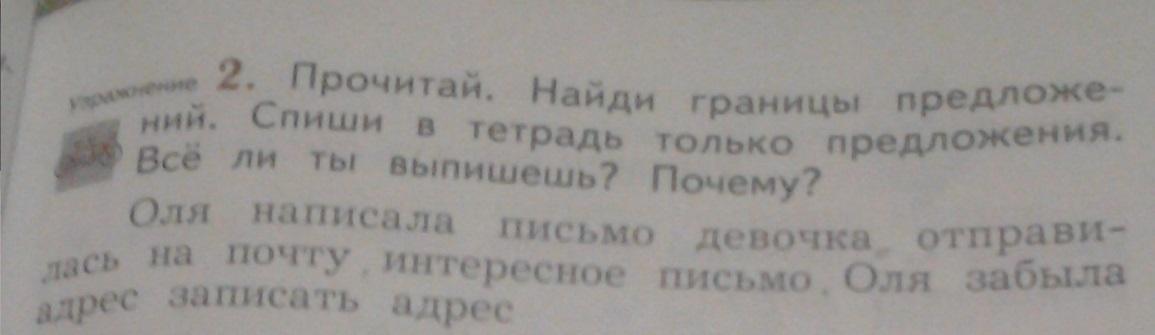 Прочитай. Найди границы предложений. Спиши в тетрадь только предложения.Все ли ты выпишешь? Почему? Оля написала письмо девочка отправилась на почту интересное письмо Оля забыла адрес записать адрес