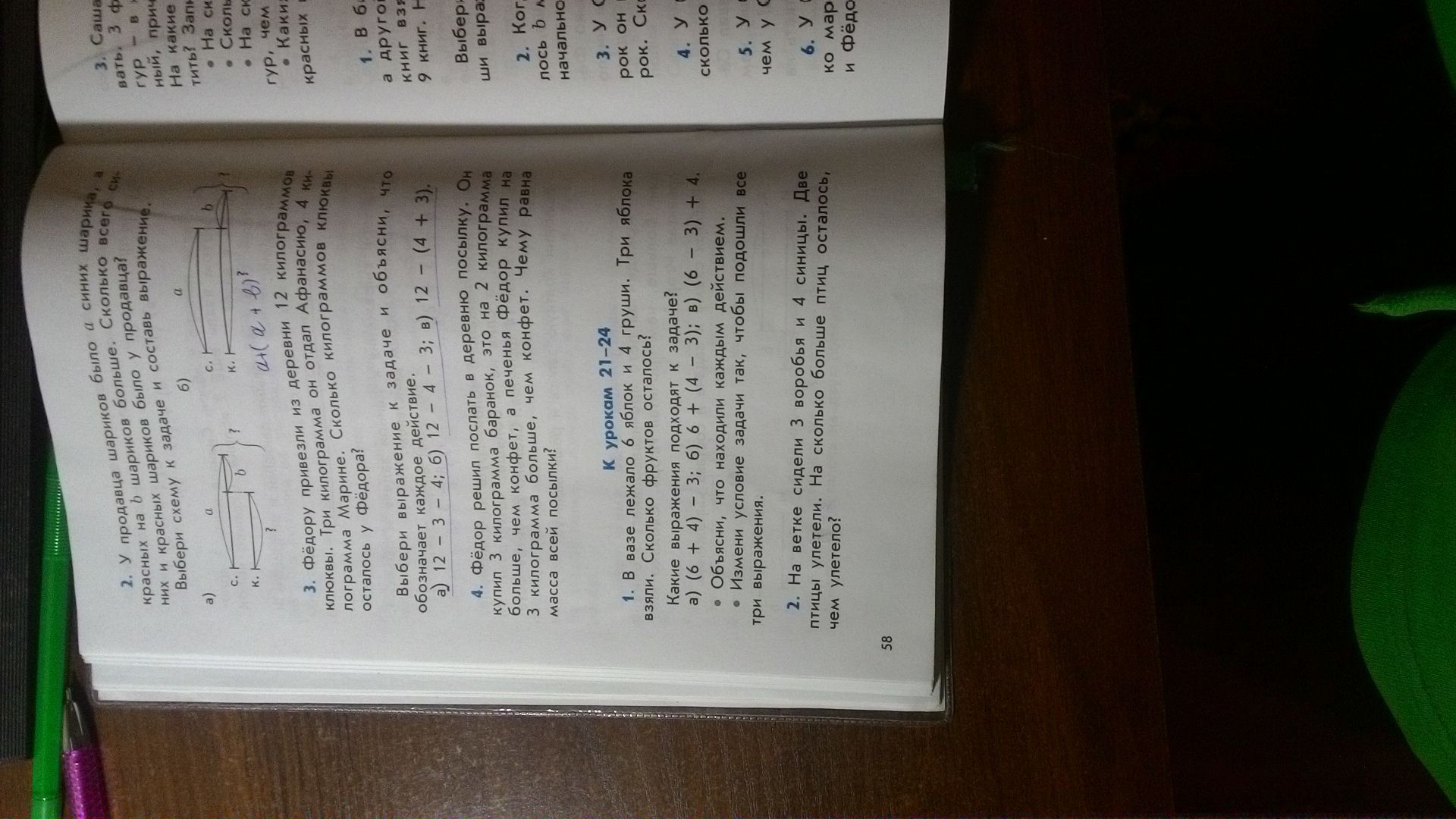 В вазе лежало 6 яблок и 4 груши. Три фрукта взяли, сколько всего осталось фруктов. Т.к нам не важно какие фрукты брали, то мы можем вычитать как из яблок (6-3)+4, так и из груш 6+(4-3), так и из всех фруктов сразу (6+4)-3.