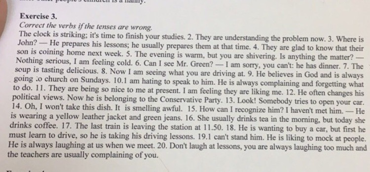 1 the clock has struck 2 understand 3 is preparing; usually prepares 4 is coming OK 5 OK 6 is having 7 tastes 8 I see 9 goes to church 10 hate 11 I feel 12 belongs 13 is trying 14 smells 15 OK 16 is drinking coffee 17 leaves 18 wants 19 likes 20 complain