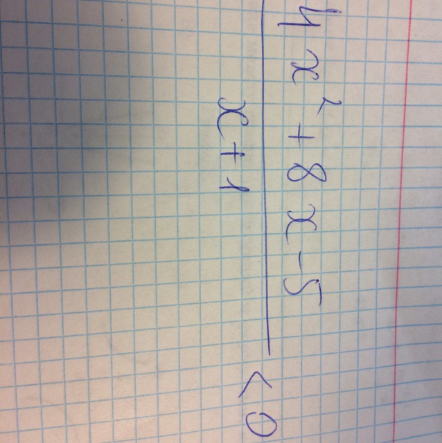 frac{4x^2+8x-5}{x+1} <0\\4x^2+8x-5=0; ,; D/4=16+20=36; ,\\x_1=frac{-4-6}{4}=-frac{5}{2}=-2,5; ;; ; x_2= frac{-4+6}{4} =frac{1}{2}=0,5\\ frac{4(x-0,5)(x+2,5)}{x+1} <0\\x+1=0; ; to ; ; x=-1\\Znaki; drobi:; ; ; ---(-2,5)+++(-1)---(0,5)+++\\xin (-infty ;; -2,5)cup (-1;; 0,5)
