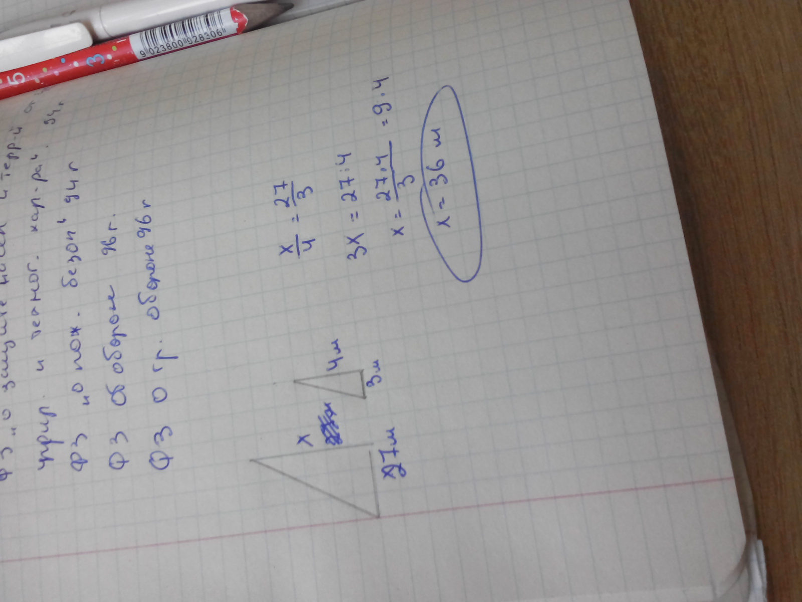 Известно, что один из катетов треугольника, подобного прямоугольному треугольнику с катетами 3м и 4м, равен 27м. Найти катеты второй катет.
