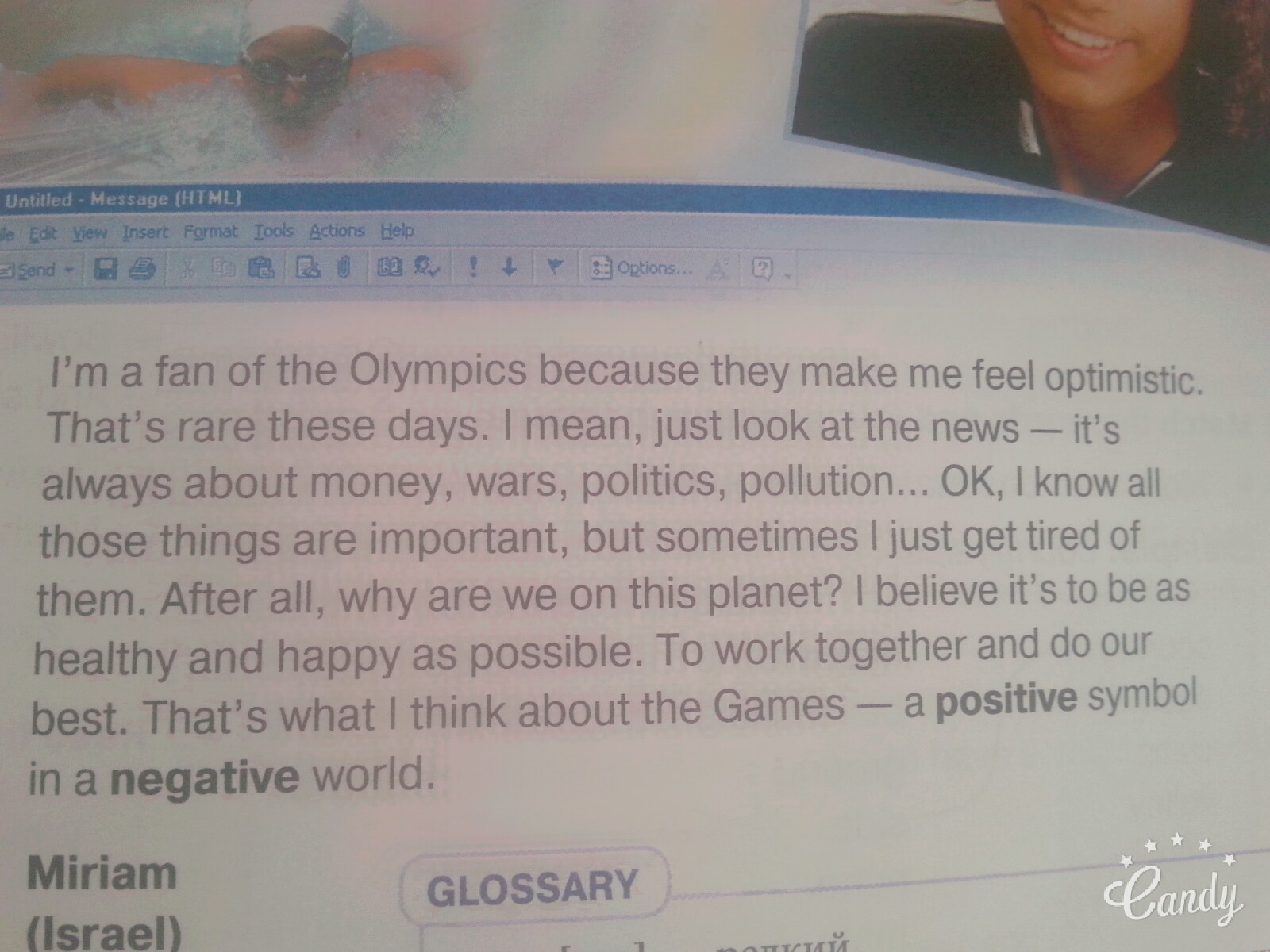 Я фанат Олимпийских игр, потому что они заставляют меня чувствовать себя оптимистично. Это редко в эти дни означают, просто посмотрите на новости-это всегда о деньгах, войны, политика, загрязнение окружающей среды ... ОК, Iknow все те вещи, которые важны, но иногда праведный устают от них. После того, почему мы на этой планете? считают, что это будет столь же здоровым и счастливым, насколько это возможно. Для того, чтобы работать вместе и делаем все возможное. Вот думаю об играх положительный символ, что в негативном мире.