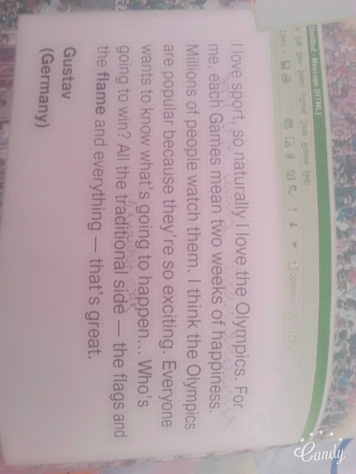 Я люблю спорт, поэтому, естественно, Я люблю Олимпиаду. Для меня каждый Игры означают две недели счастья. Миллионы людей смотрят их. думаю, что Олимпийские игры пользуются популярностью, потому что они настолько захватывающим. Каждый хочет знать, что будет дальше ... Кто победит? Все традиционные боковые флаги и пламя и все, что здорово.