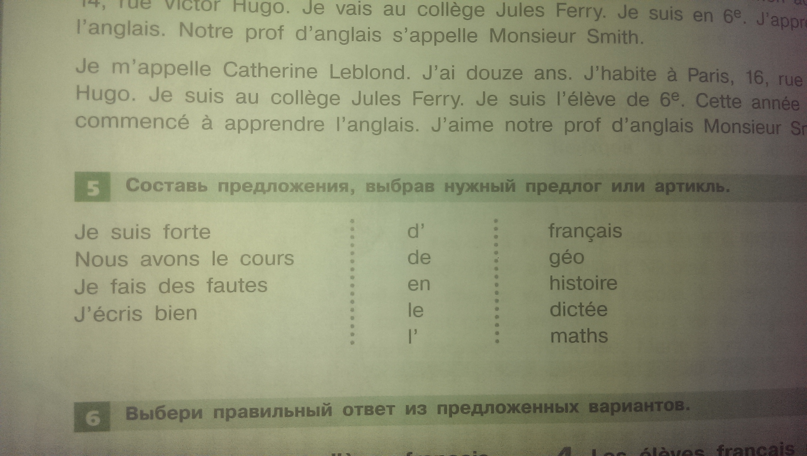 Je suis forte en math; Nous avons le cours de français; Je fais des fautes en dictée; J'ecris bien l'histoire.