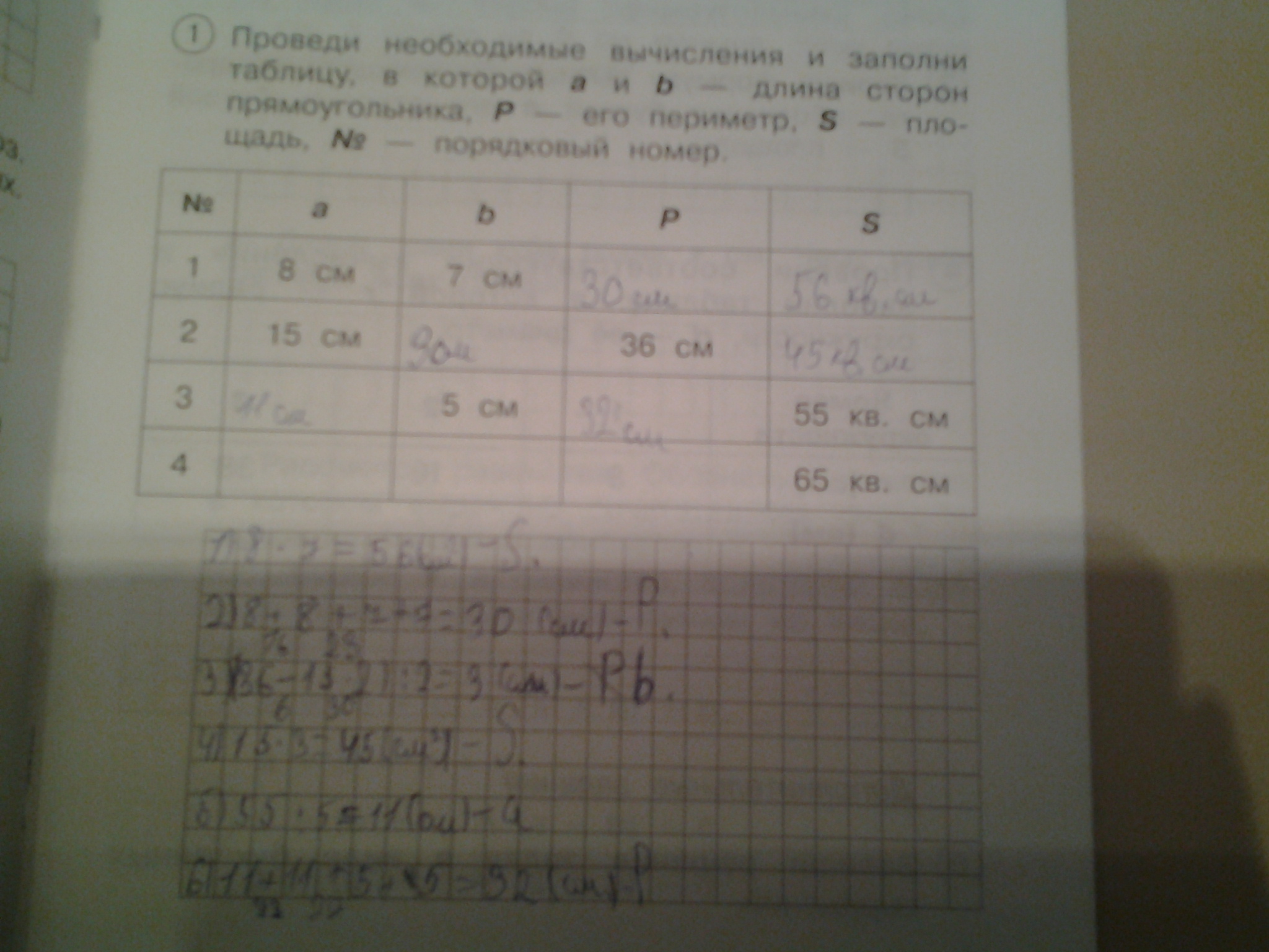 Площадь прямоугольника 65 см .кв, как найти длину сторон и периметр(на фотографии последний столбик)