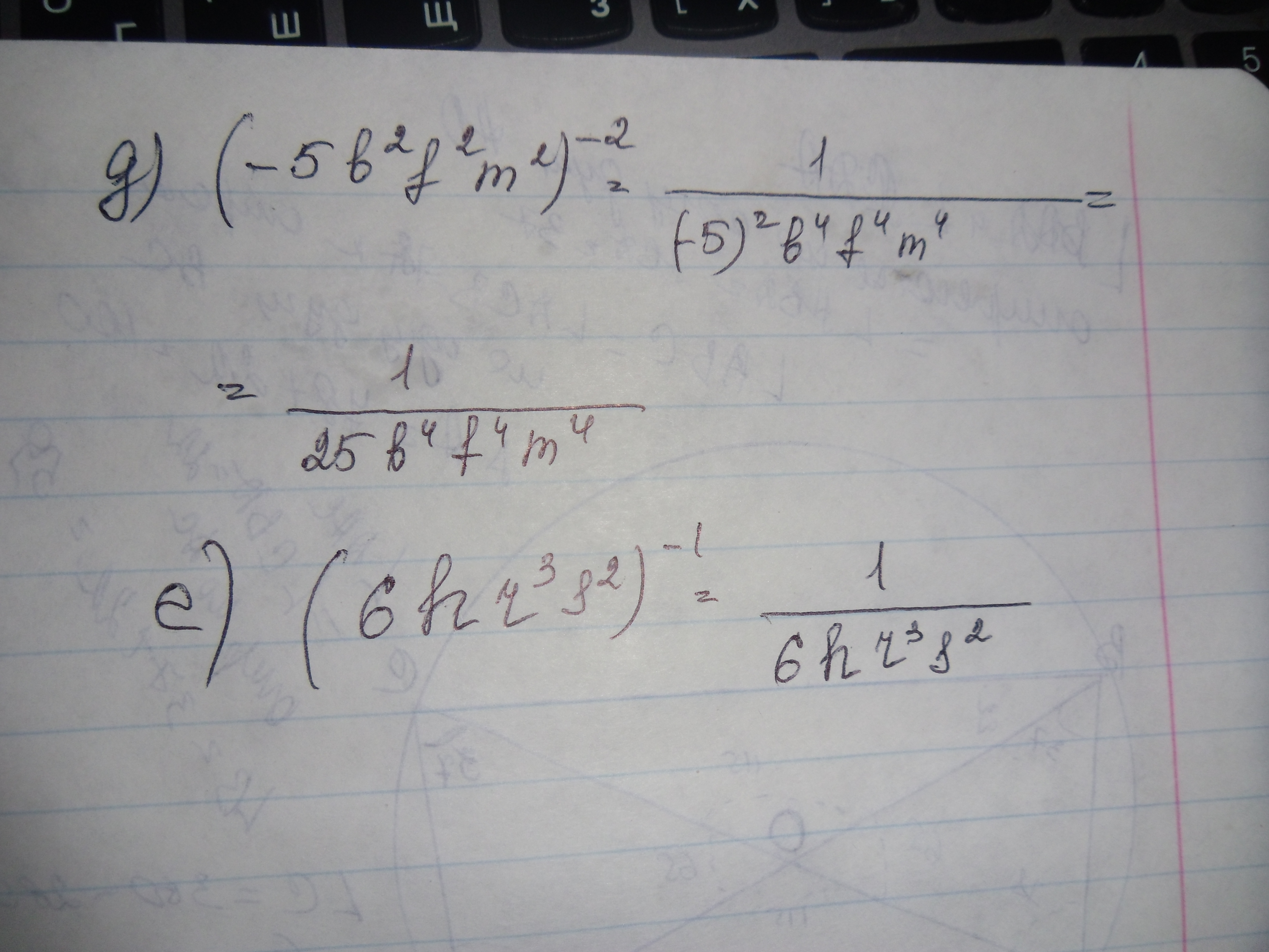 д) (-5b²f²m²)⁻²=1/(-5b² f² m²)²=1/(25b⁴ f⁴ m⁴)