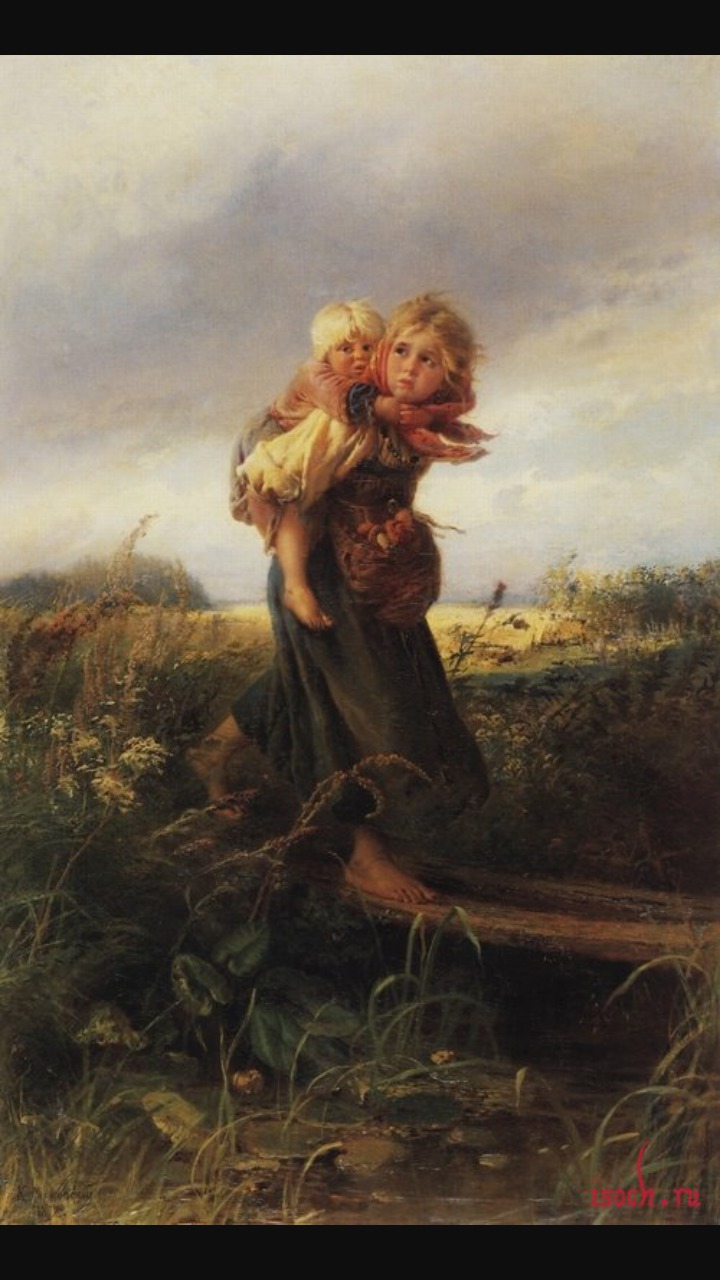 На переднем плане картины мы видим темные воды узкого ручейка, через который перебегает по мостику девочка, несущая на спине своего маленького брата. Позади ребят уходящий к горизонту массив леса, в который они ходили за грибами.