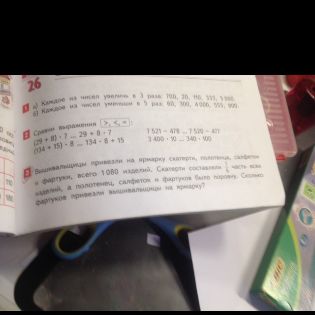 Ск-1/6 от 1080. П-? поровну. С-? поровну Ф-? поровну Фигурной скобкой соединить все строки } и за скобкой 1080 изд. 1080:6=180(изд) скатер. 1080-180=900(изд) П,С,Ф. 900:3=300(изд) фартуков