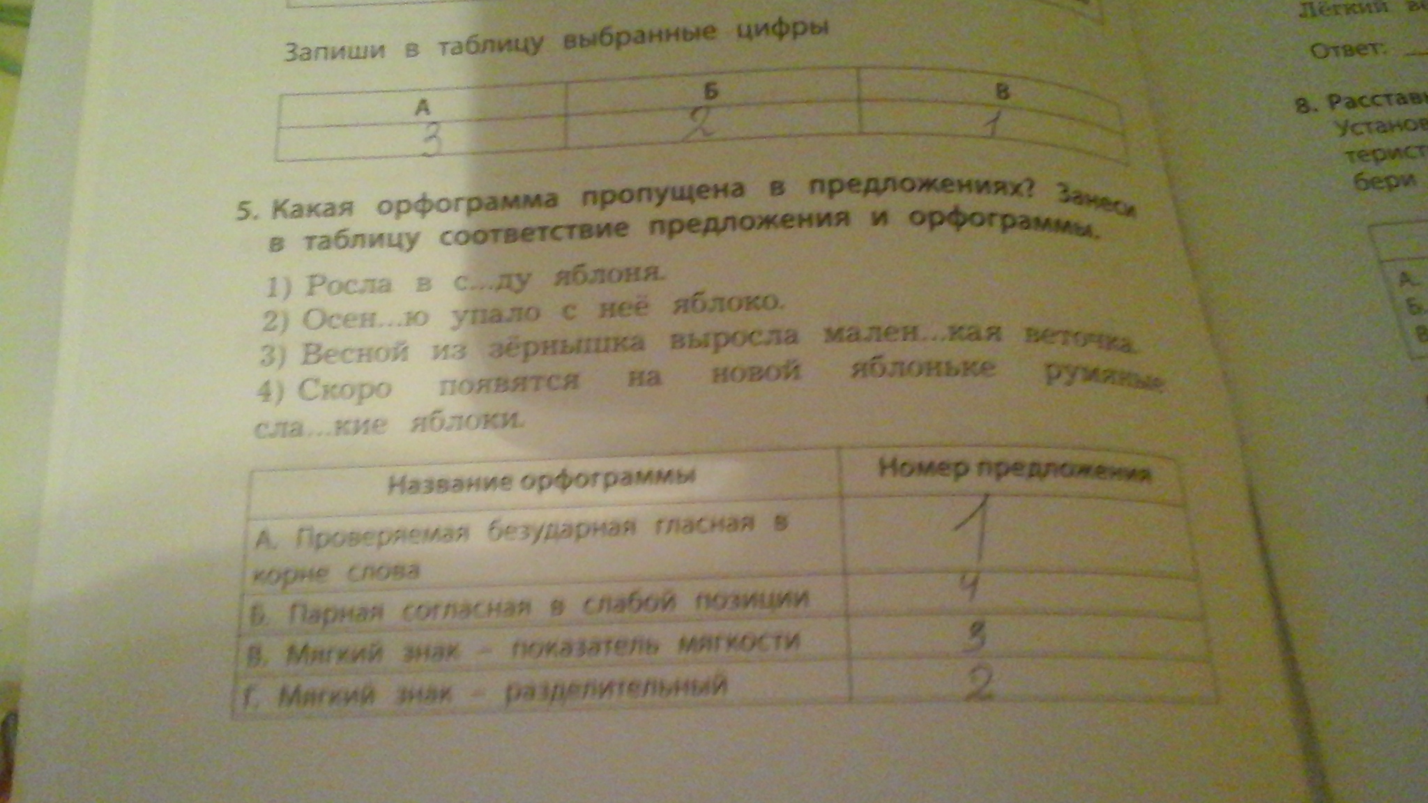 в пятом задании нужно написать номер предложения например в котором в одном из слов есть разделительный ъ знак и т.д и надо вписать этот номер предложения под каждой буквой
