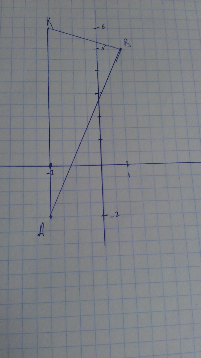 Постройте треугольник АВК по координатам его вершин А(-2;-2) В(1;5) К(6;-2).Найдите координаты точки пересечения стороны Ак с осью ординат