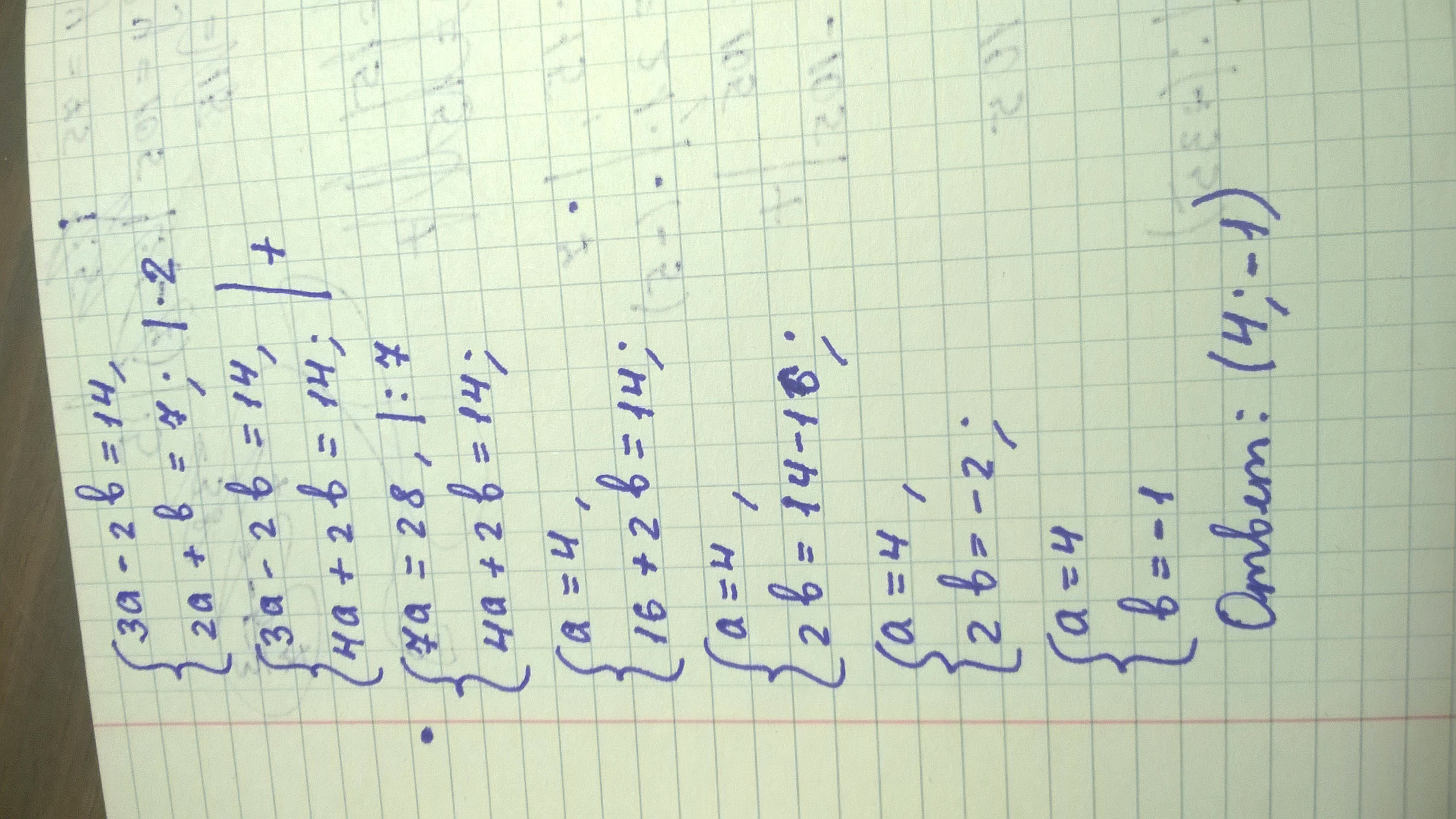 Нам нужно избавиться от одного из неизвестных. Проще всего избавиться от b: умножаем второе уравнение на 2. Складываем уравнения : -2b и 2b взаимно уничтожаются. Получившееся уравнение делим на 7, а второе просто переписываем. Находим а и подставляем во второе уравнение. Находим b. Все просто ;)