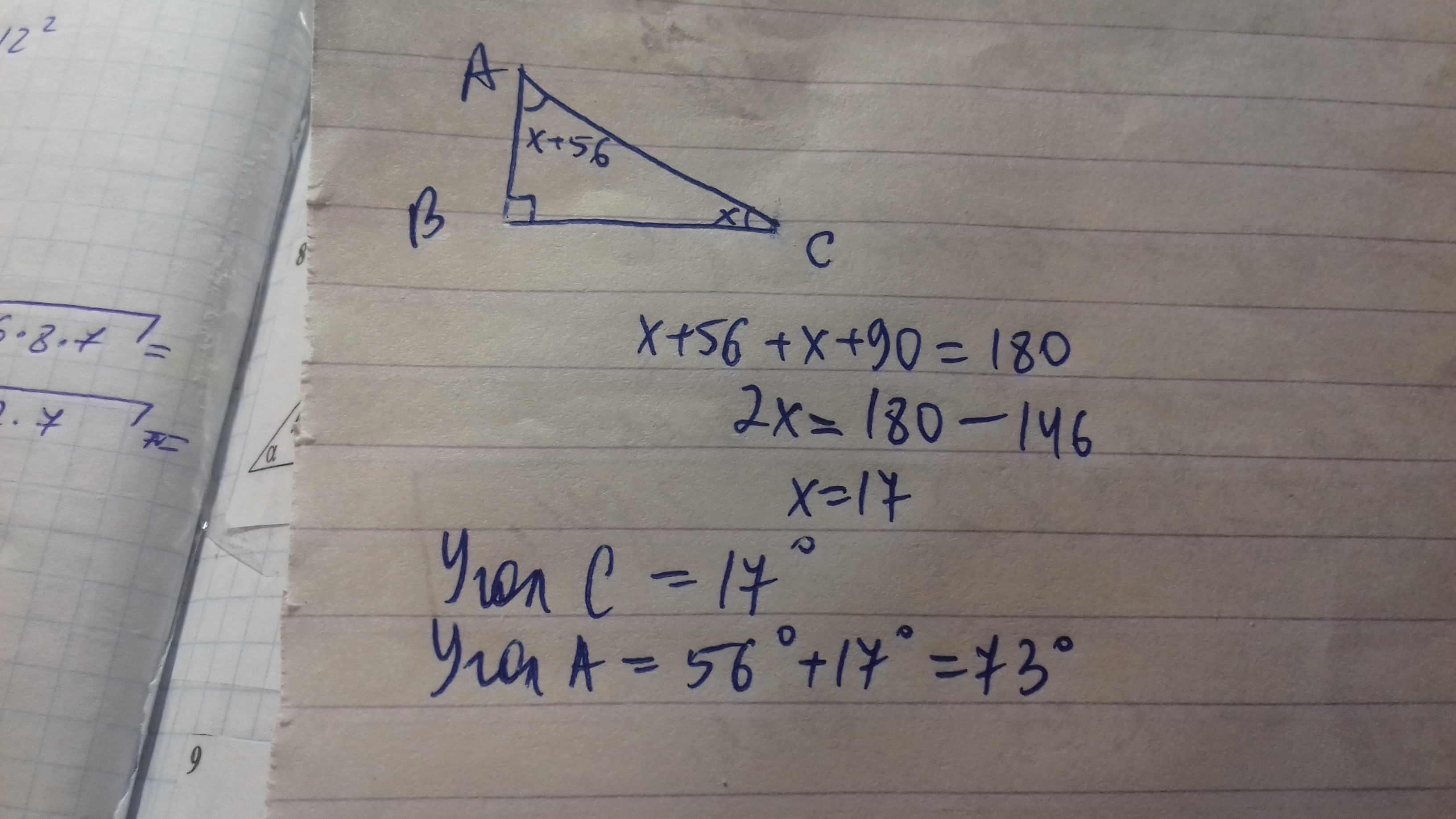 В треугольнике ABC угол B - 90 градусов. Угол A на 56 градусов больше угла C. Найдите углы треугольника если периметр = 180 градусам