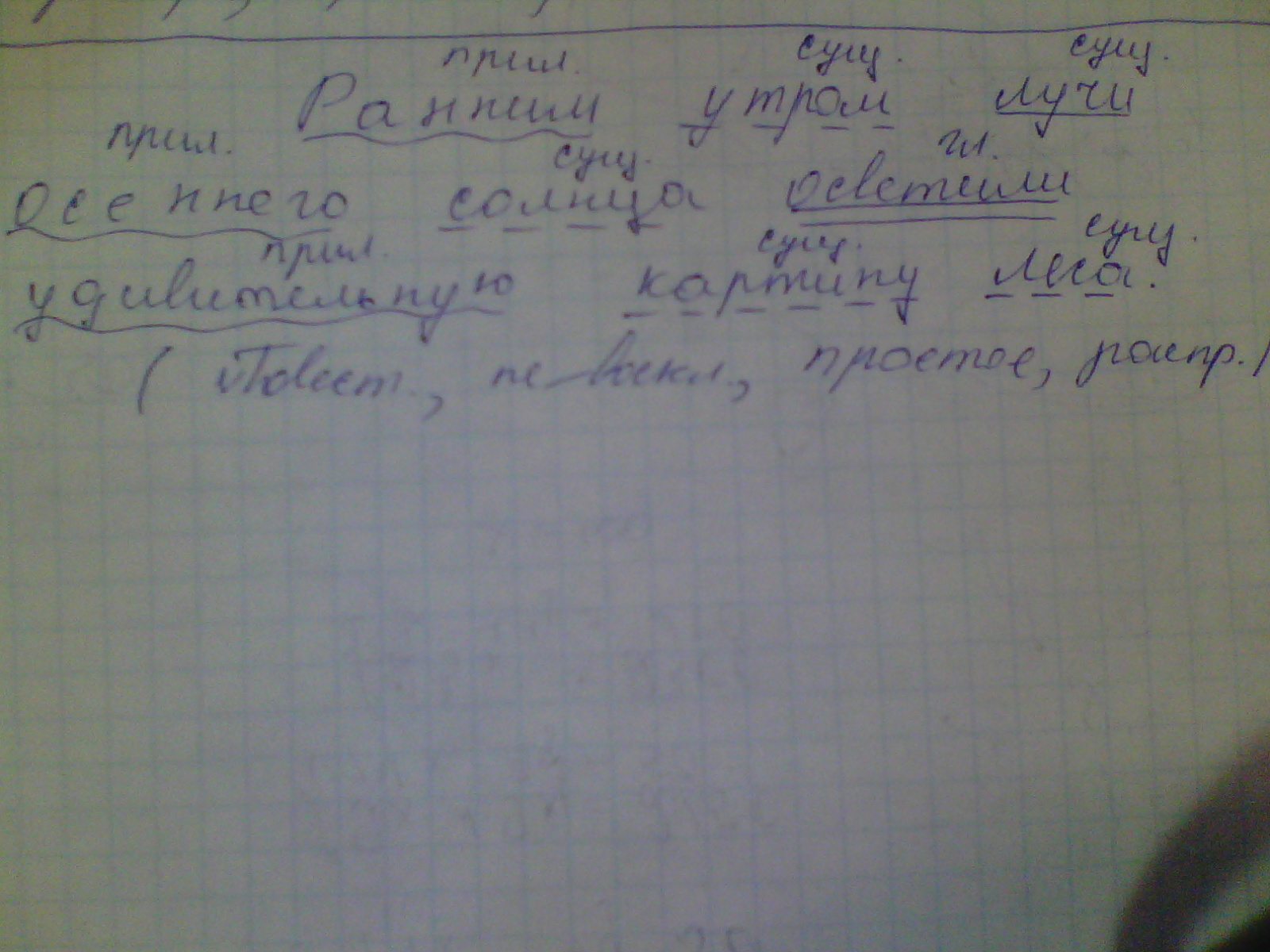 Синтаксический разбор предложения ; ранним утром лучи осеннего солнца осветил удивительную картину леса . Так же разобрать это предложение по частям речи и подчеркнуть