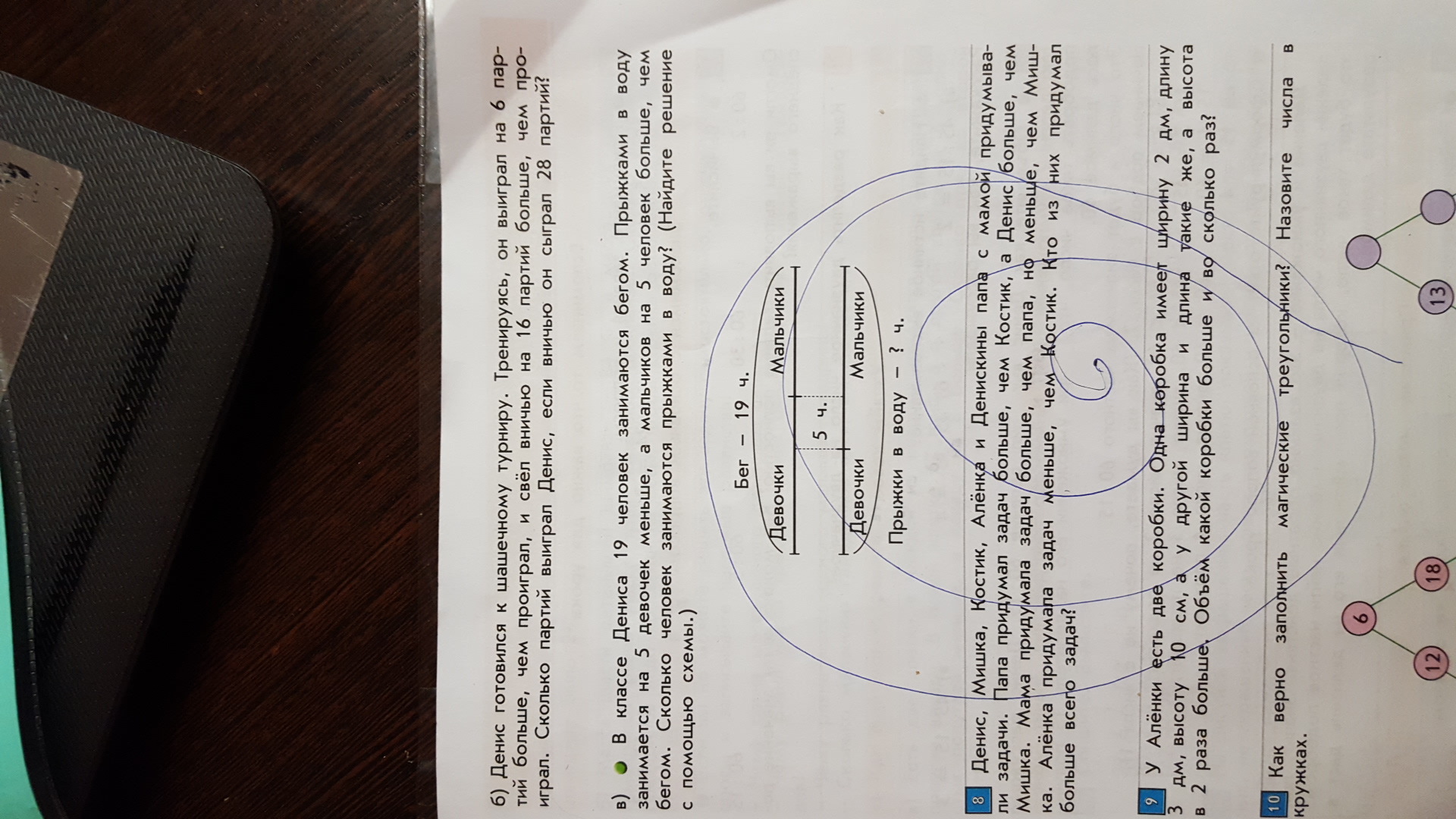 в классе Дениса 19 человек занимаются бегом. Прыжками в воду занимается на 5 человека меньше ,а мальчиков на 5 человек больше, чем бегом сколько человек занимаются прыжками в воду