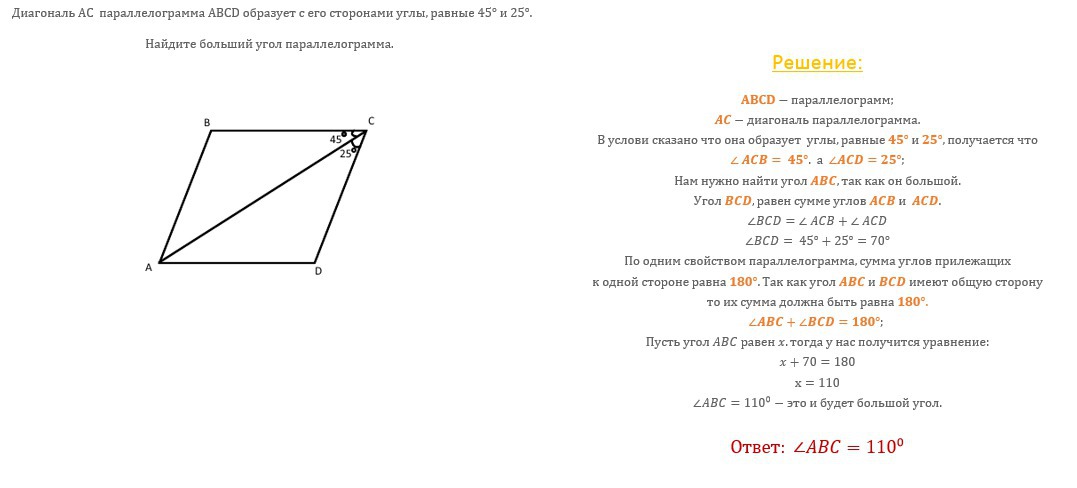 1)В равнобедренном треугольнике abc ab=bc . Найдите ac , если высота bh=8 ab=10 .2)Диагональ ac параллелограмма abcd образует с его сторонами углы, равные 45° и 25°. Найдите больший угол параллелограмма.