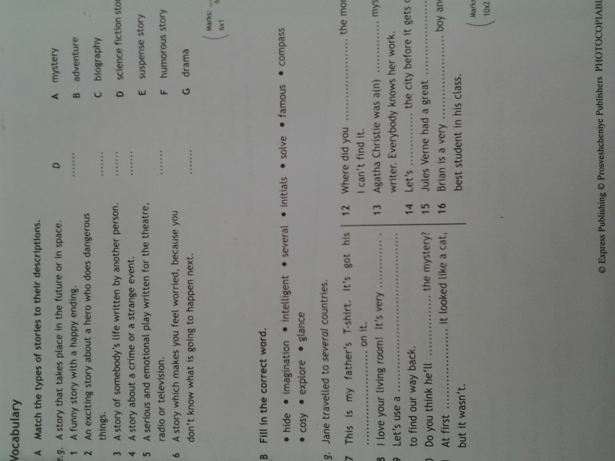 A 1f 2b 3c 4a 5g 6e B 7) initials; 8) cosy; 9) compass; 10) solve; 11) glance; 12) hide; 13) famous; 14) explore; 15) imagination; 16) intelligent.
