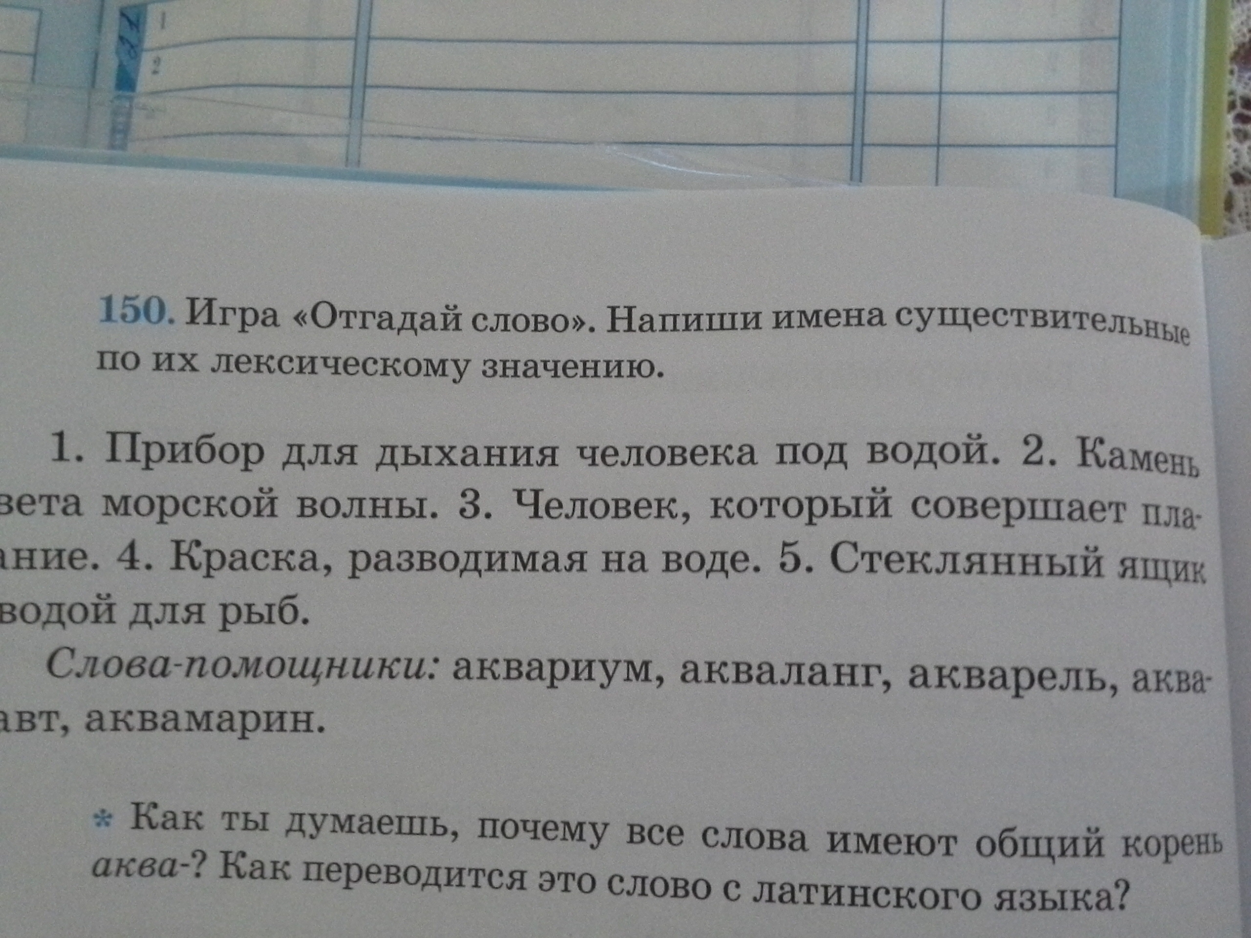 1. Акваланг. 2. Аквамарин. 3. Акванавт. 4. Акварель. 5. Аквариум